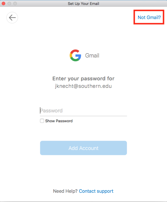 - When prompted to add an account, enter your Southern email and click Advanced Options. Click Connect.