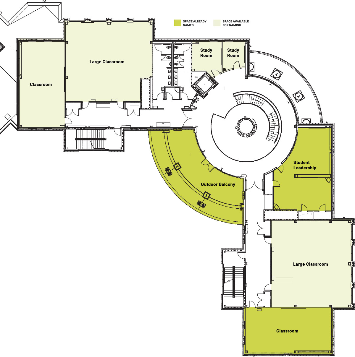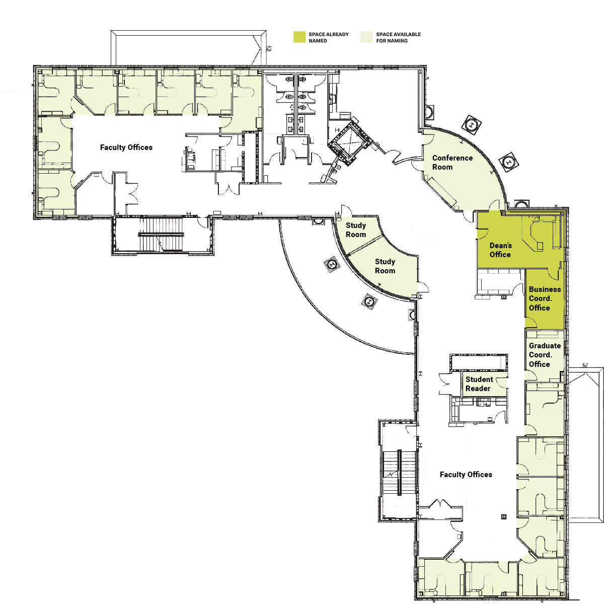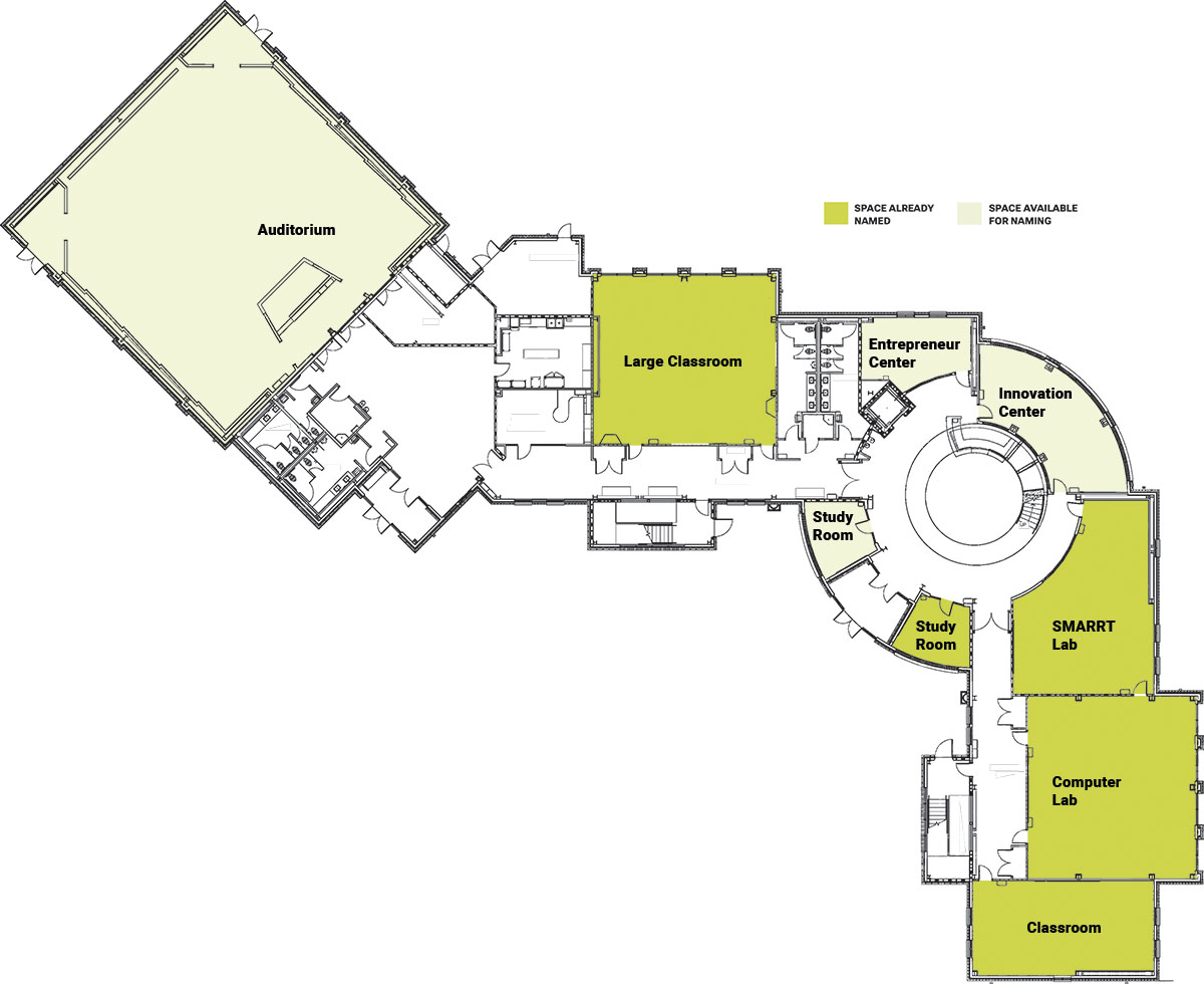 Click the expansion arrows (below, right) to view larger Ruth McKee School of Business floor plans and a named spaces color key. Email advancement@southern.edu or call 423.236.2829 with named spaces inquiries.