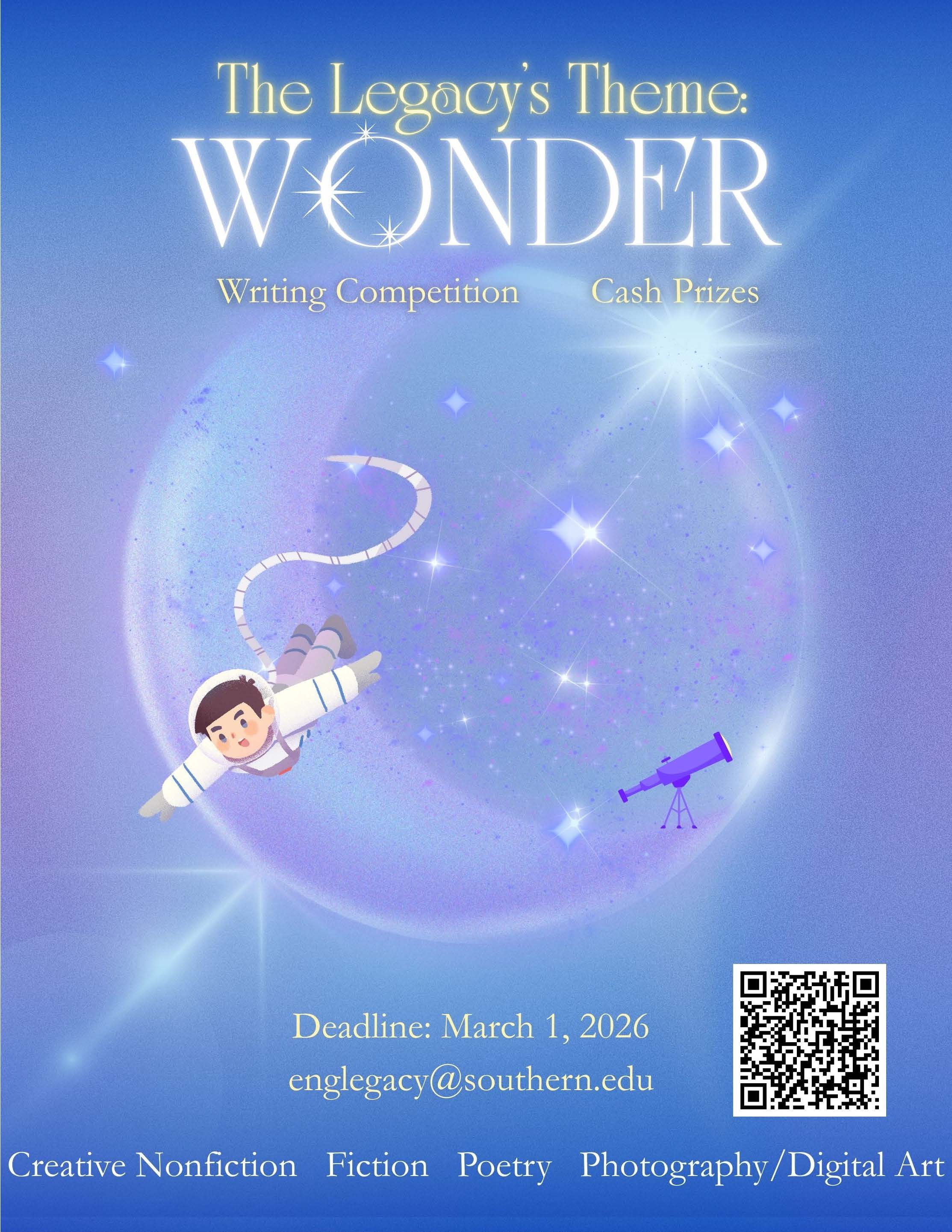 fiction, poetry, and photography/digital art. Email englegacy@southern.edu to participate! Deadline: March 1, 2026