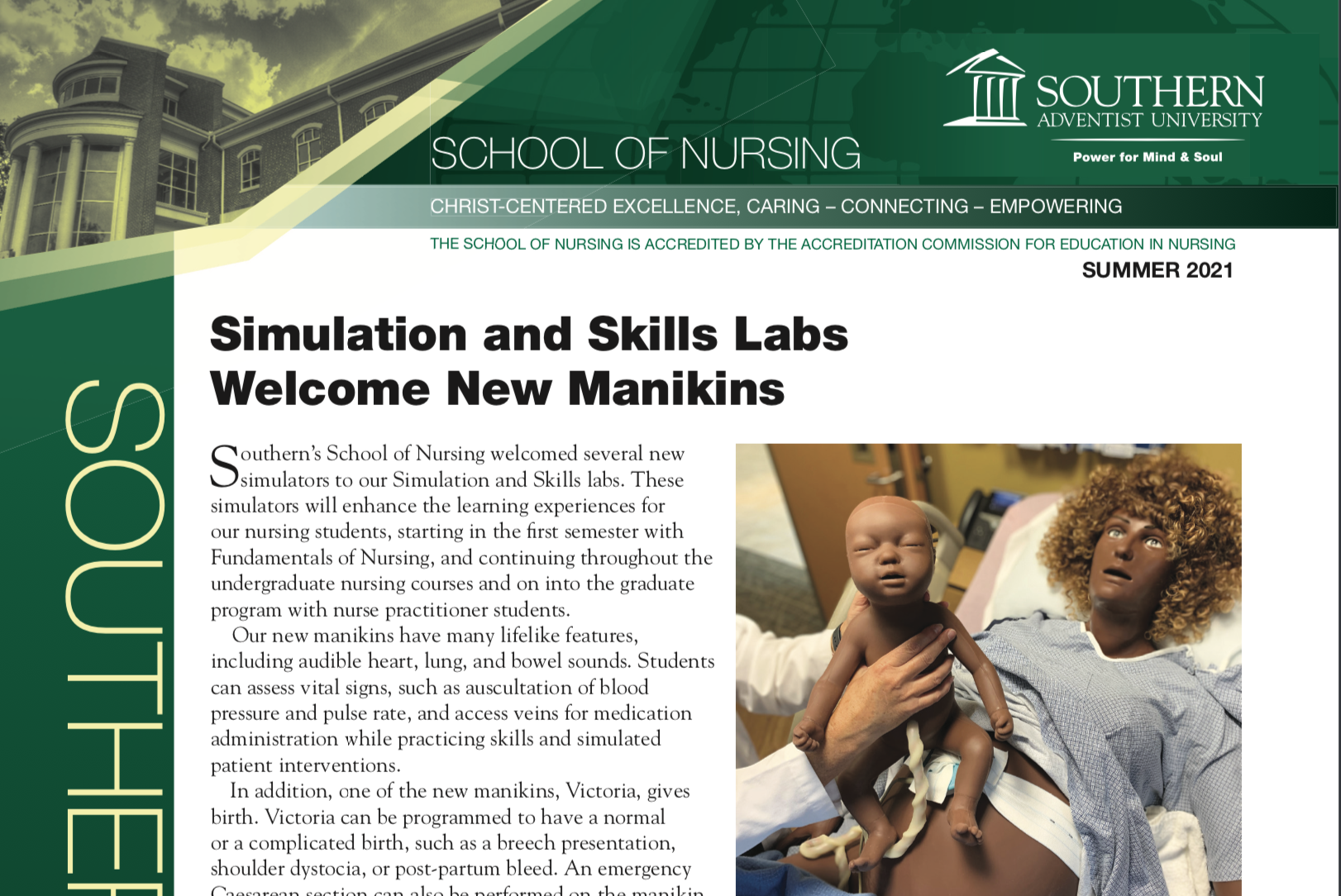 Our current nursing majors, over 800 in number, are a passionate, energetic, and integral part of the student body at Southern Adventist University. Our facilities are designed to facilitate maximum learning experiences. More importantly, our dedicated faculty and staff seek to provide a positive, nurturing environment and transmit values that exemplify the tradition of excellence in Christian nursing education.