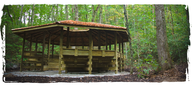Completed in 2010, our Cherokee Council House is an open-aired heptagonal (seven-sided) building that is a modified representation of the traditional Cherokee Council House. Historically, this style of building provided seven sections of seats within, giving each clan a section for its representatives within the governmental structure. The seven sections of seats surrounded the sacred fire. Our shake shingled, open-roofed council house can easily accommodate over 70 adults in bleacher-styled seating around the central fire ring. This building brings people together like no other, making it the ideal place for an evening worship service around the fire. Seventy voices singing praise to God in this structure penetrates your soul… It’s a powerful spiritual experience!