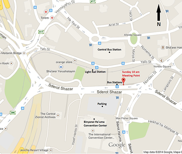 The weekends begin Friday mornings after breakfast at 9:00 a.m. and end Sunday mornings at 10:00 a.m. when all participants must reconvene near the Central Bus Station in Jerusalem to return to the guesthouse. Volunteers are asked to gather at the bus stops south of the Central Bus Station. A detailed map of this area is found here, below. In case of an emergency, contact Prof. Yossi Garfinkel at: +972-2-525-9220 (from outside Israel) or +05-2-525-9220 (from within Israel).