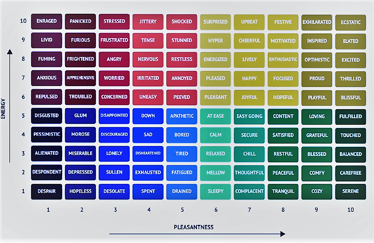 - red, blue, green, and yellow - each representing a different set of feelings. Feelings are grouped together on the mood meter based on their pleasantness and energy level.