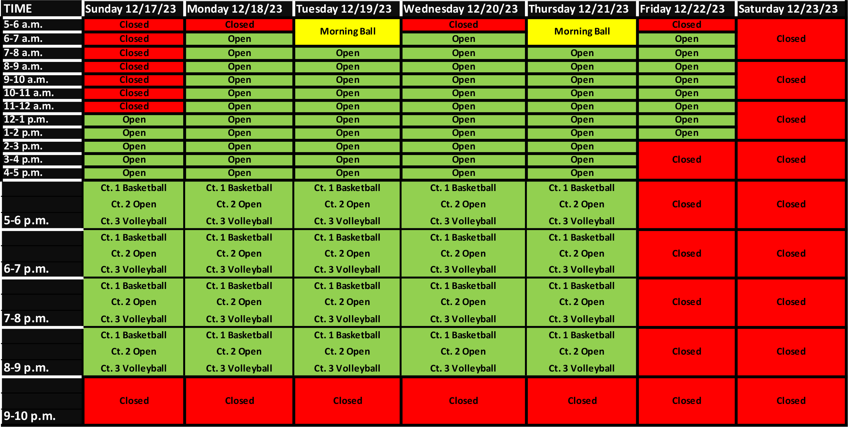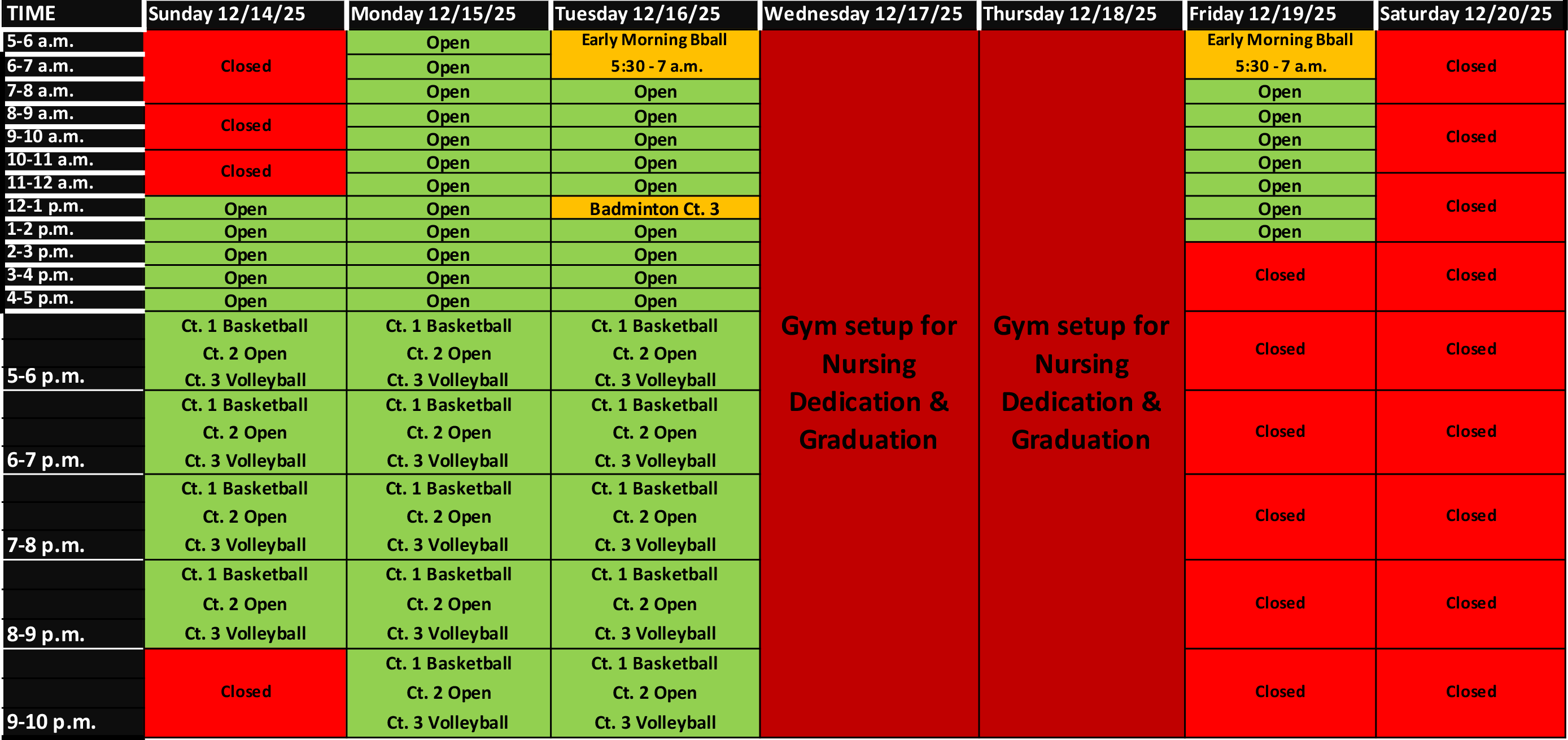 The gymnasium is closed when in use for classes or other events (See weekly schedule below). Current Students and Staff only.