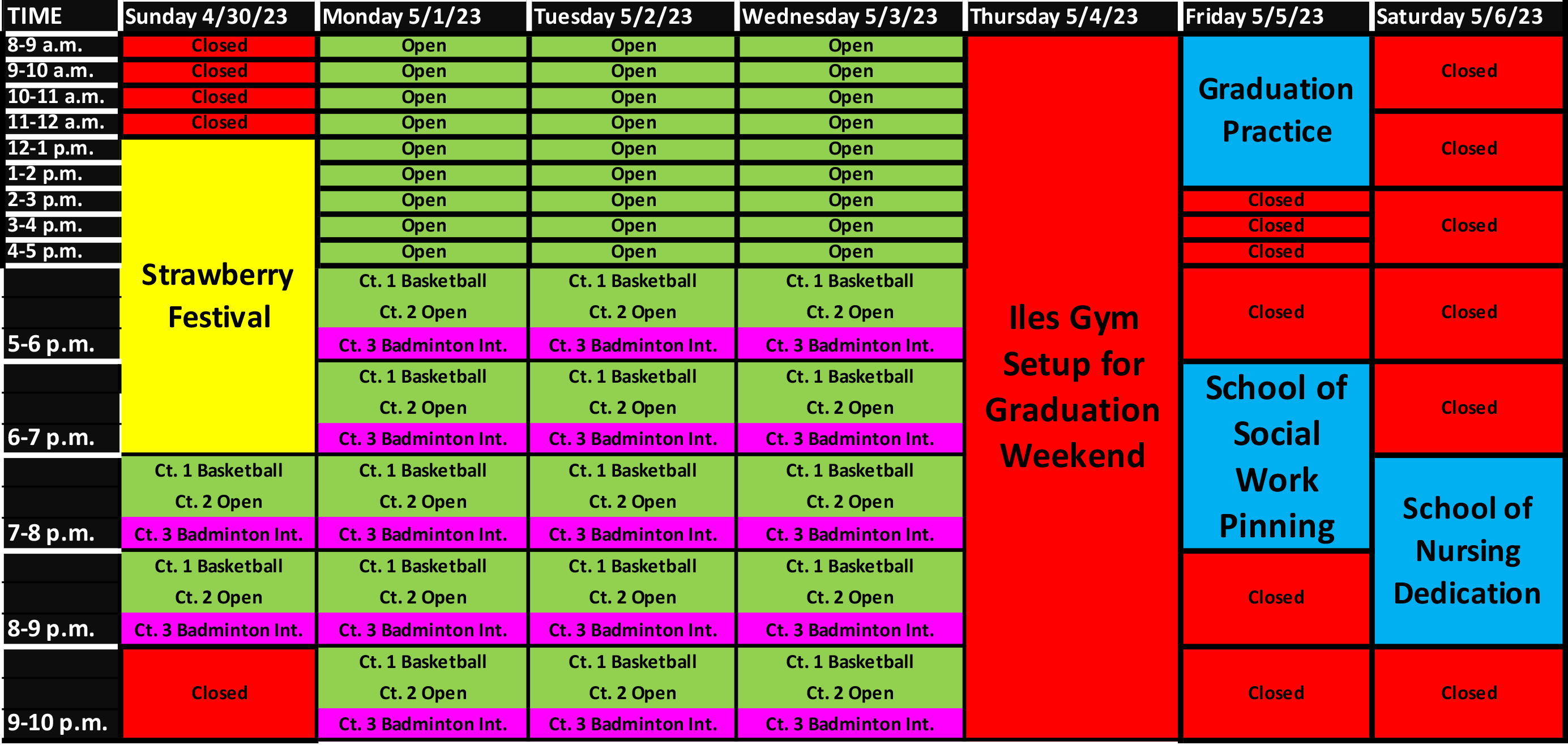 The Iles P.E. Center has full-sized basketball, volleyball, and badminton courts