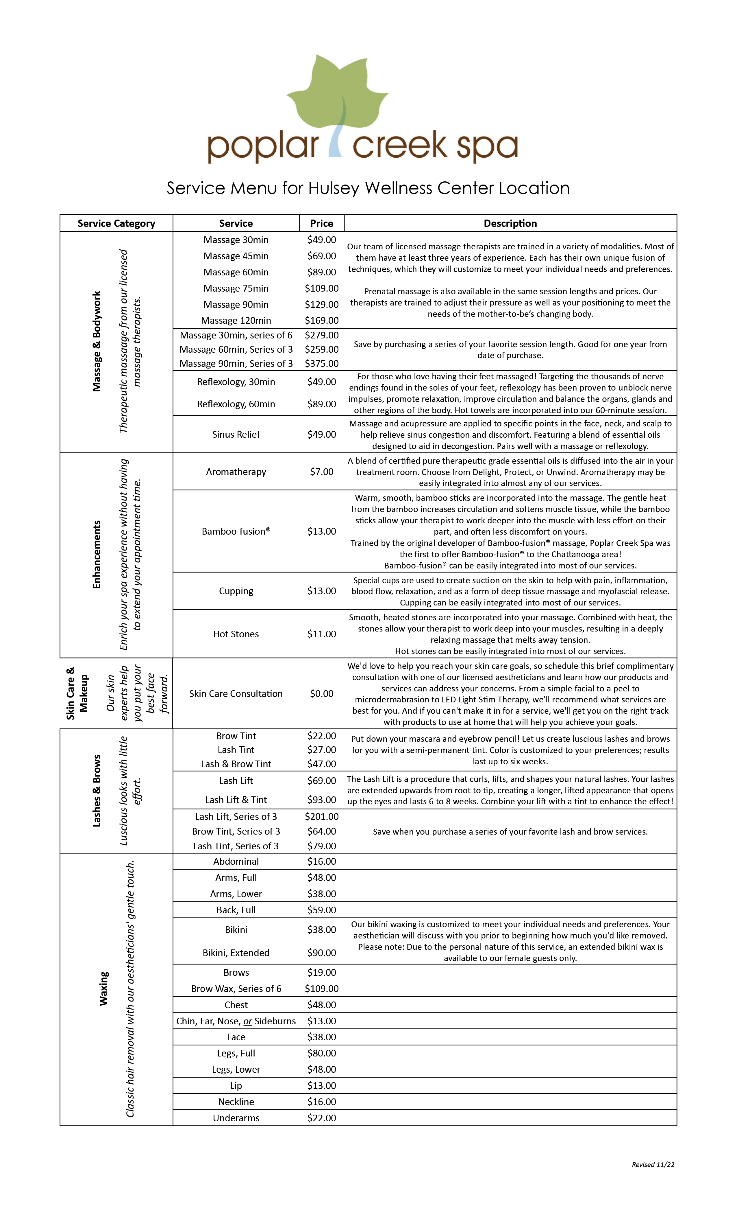 (Massage and Aesthetic Services are not available when the Hulsey Wellness Center