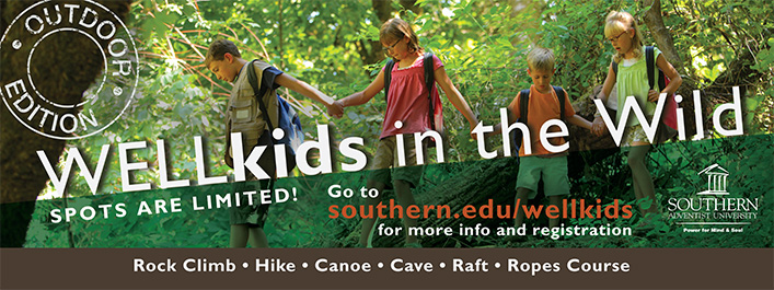 Keep your kids moving and exploring the great outdoors this summer with the WELLkids in the Wild program. These week-long sessions begin June 6 and June 27, meet from 9 a.m. - 1 p.m. (9 a.m. -4 p.m. on Fridays for off-campus field trips), and offer outdoor adventures facilitated by graduate students in the Outdoor Leadership program at Southern. Activities are subject to weather, but may include rock climbing, hiking, canoeing, ropes course, rafting, and caving. Extended child care is available until 5 p.m. Monday through Thursday with activities in the Hulsey Wellness Center pool. See southern.edu/wellkids for more information and to register.