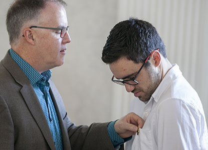 Mark McKinney, ’83, MD, is a second-generation alumnus and parent to Caleb McKinney, a senior finance major. Both participated in the pinning ceremony. Mark’s sister, Karen (McKinney) Brown, ’90, and her son, Nikoli, a senior management major, also shared in the event.