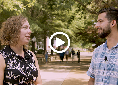 Moses Maier, ’17, Alumni Association council member, shares what he enjoys about Homecoming Weekend with new Alumni Relations director Cheryl (Fuller) Torres, ’05.