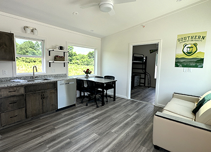Carlos Torres, senior public relations major, recently toured one of the units. “The cottages are beautiful!” he says. “They’re a mix of rustic and modern, which I think is really cool. It’s an open area with very modern aspects to it, and you’ll feel like you’re close to nature.”
