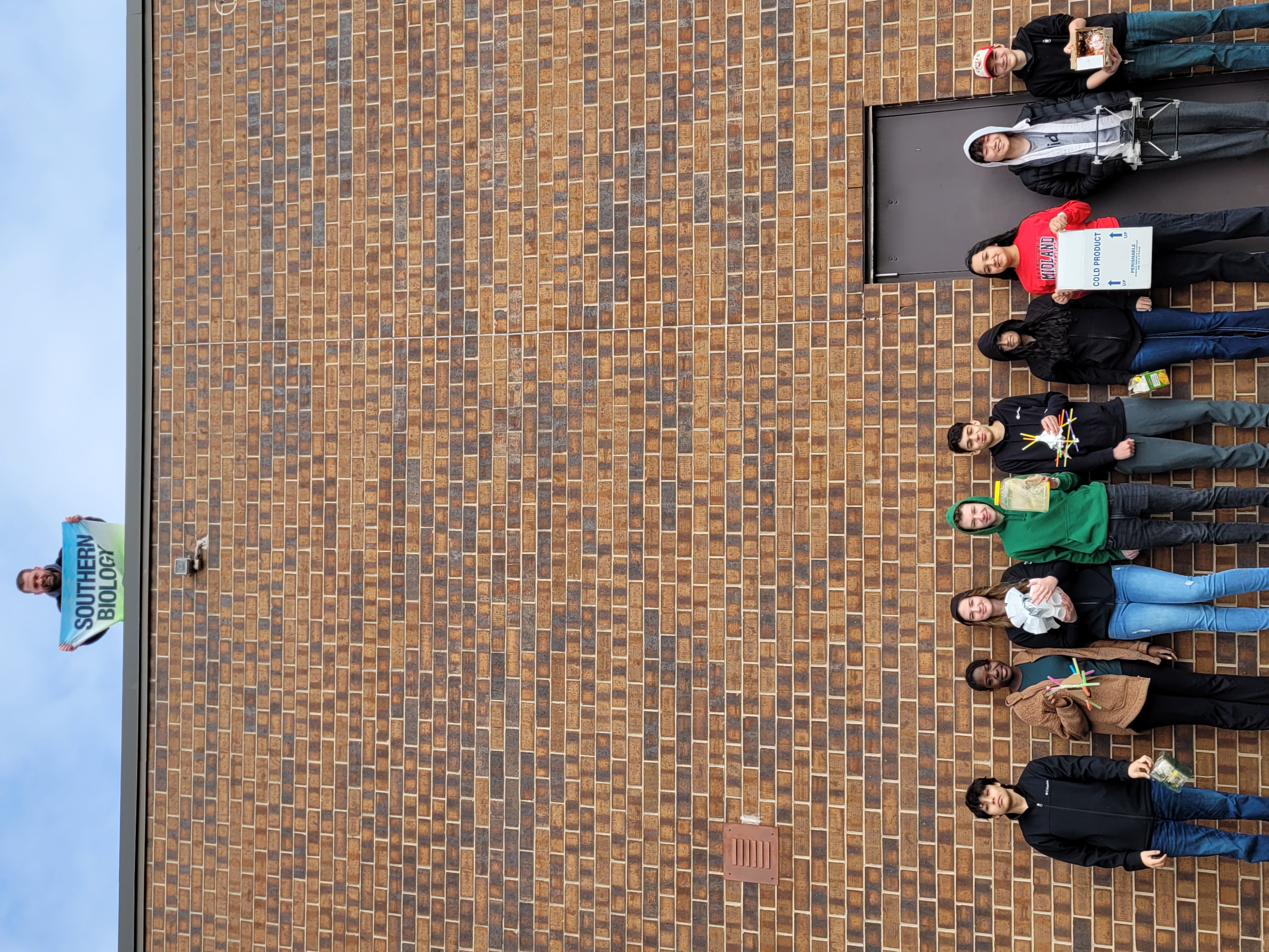 The annual Physical Science Egg Drop at Midland Adventist Academy. Students are pictured with their projects after the drop. Four were successful.
