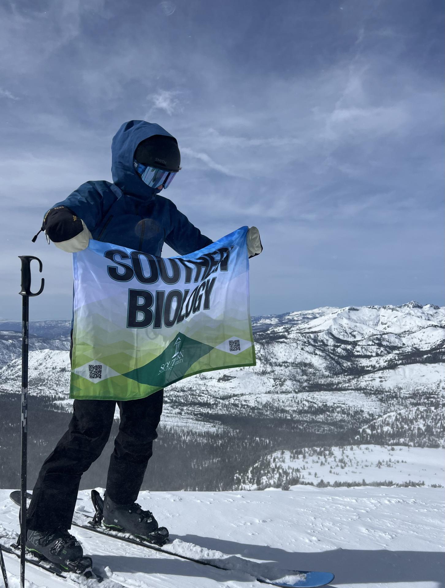 This image was taken at the peak of mammoth mountain on 3/13/24. The event was snow skiing and the individual in the photo is Trevor Cain. The photographer was David Cain.