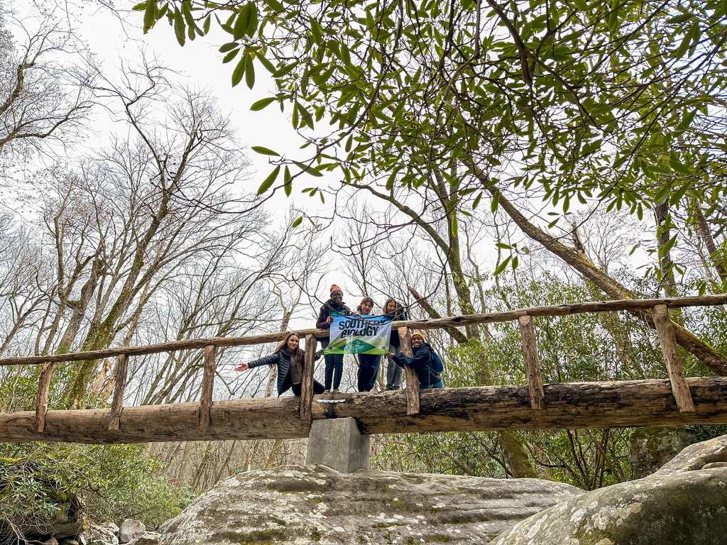 From left to right, Elizabeth Baldwin, Tavimbawanashe Tskirai, Allison Kim, Zoei Toh, and Tamupiwanashe Tskirai on a hike on Porter's Creek Trail on April 5, 2024. Stopped along the way to the waterfall on a little bridge to snap a quick picture!