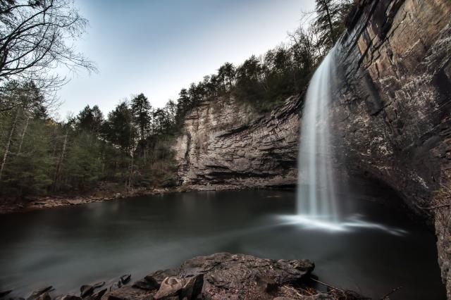 Foster Falls is a stunning 60-foot waterfall that cascades into a deep pool below. The area is adorned with mountain laurel, azaleas, and hemlocks that thrive above the falls, along the sandstone overlook, and in the gorge below, enhancing its natural beauty. An easy hike leads to the top of the falls, where a trail descends into the gorge. This trail crosses a suspension bridge over the creek, providing access to the base of the falls for a delightful view and experience.