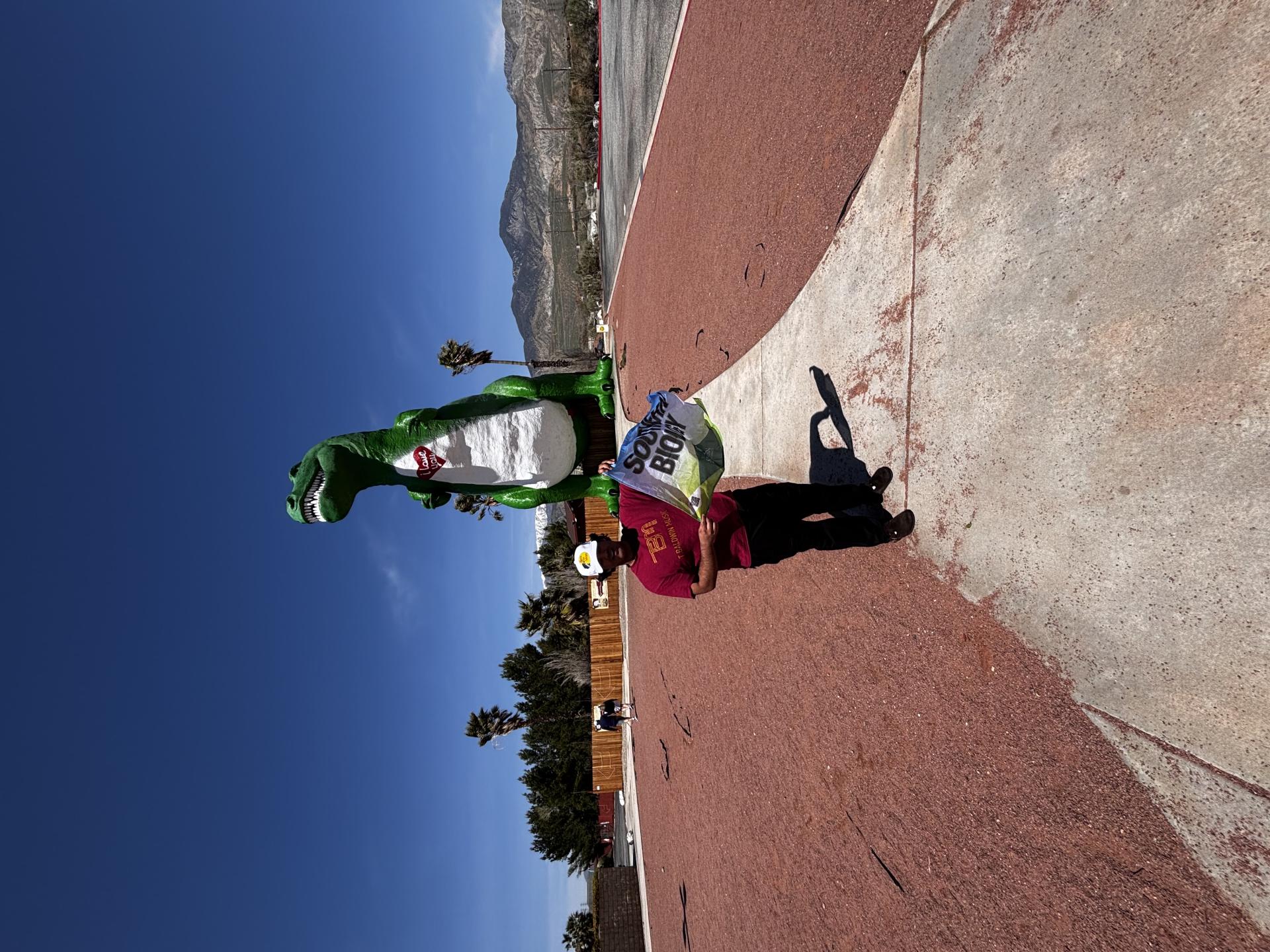 I am standing in front of the T-Rex statue located on an Indian Preservation in Cabazon California. It is known for having the largest concrete building dinosaurs in North America!