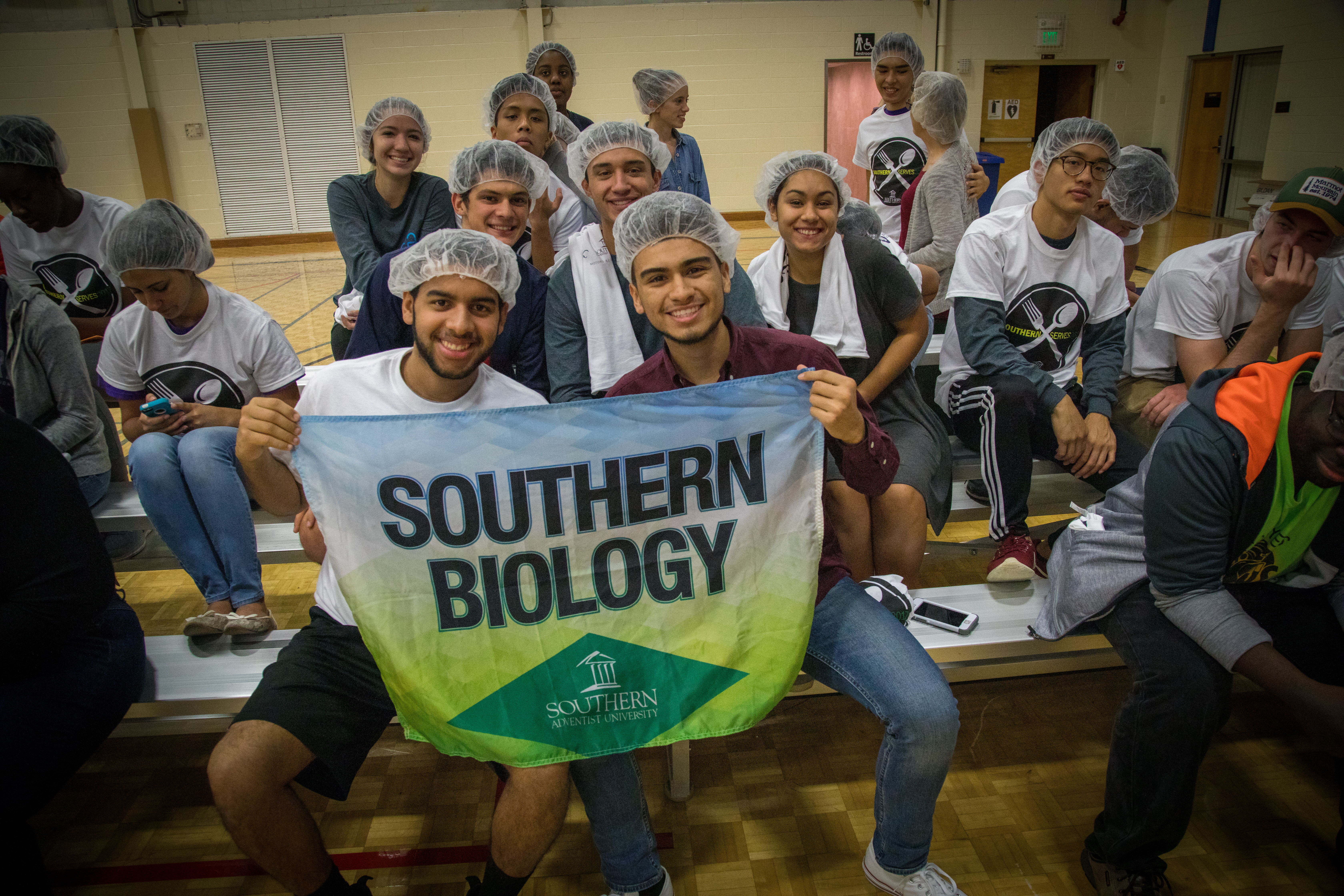 Biology students, 2018, participate in preparing food for "Feed My Starving Children."