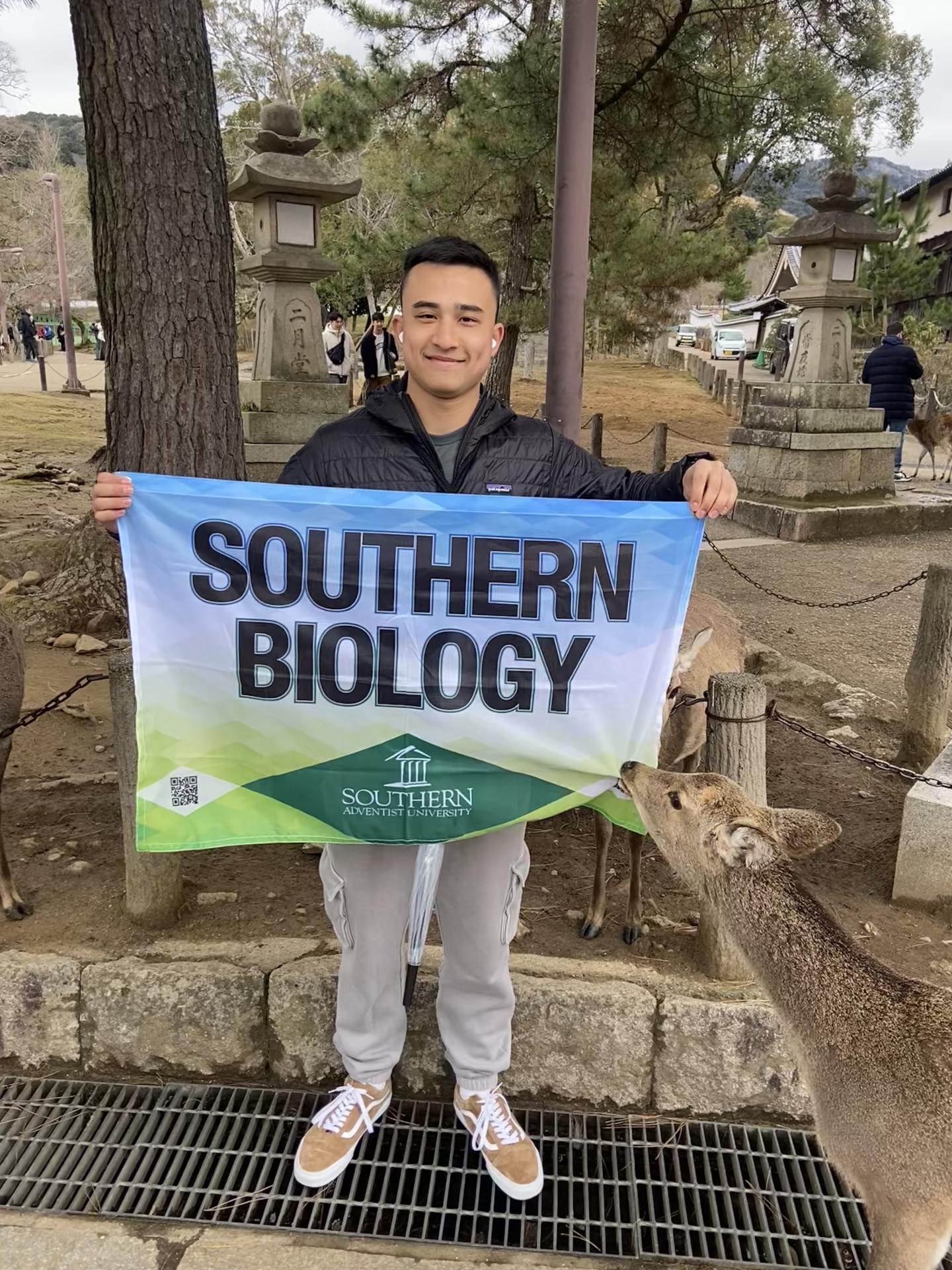 During our tour of Nara park, one of the infamous bowing Sika Deer tried to eat the flag as we were trying to take the picture. They really do bow like crazy in front of you, especially when you have food. This photo was taken on March 19, 2025 with Rylan Yamamoto holding the flag.