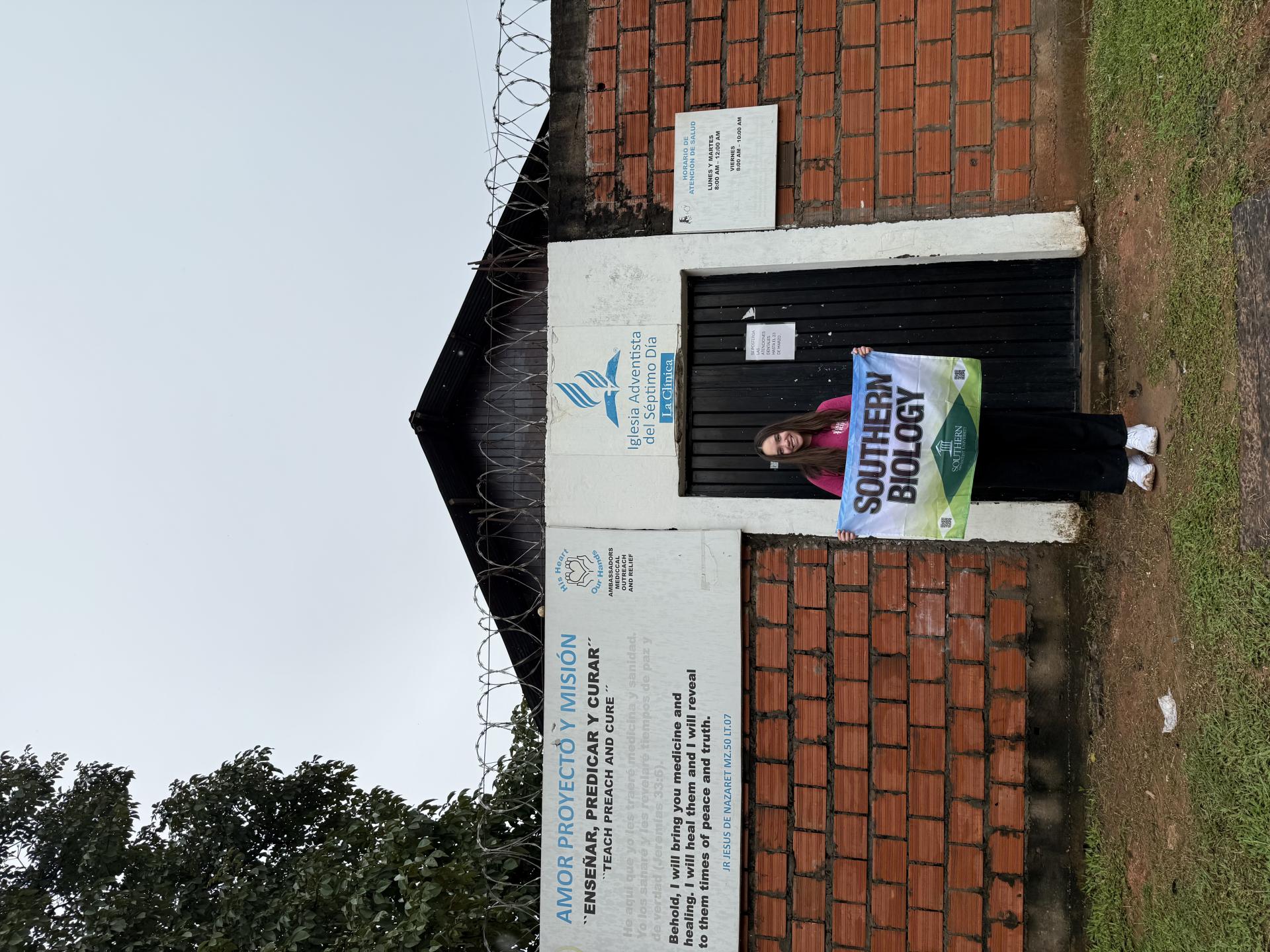 Jordyn Jamison in front of Iglesia Adventista del Séptimo Día La Clínica the Amor project location in Pucallpa, Peru. This photo was taken after the students arrived from their 24+ hour travel day. Behind those doors is where the final clinic of the trip takes place for the locals in the area. After this photo was taken, the students unpacked their bags and met in the clinic for Sabbath worship.