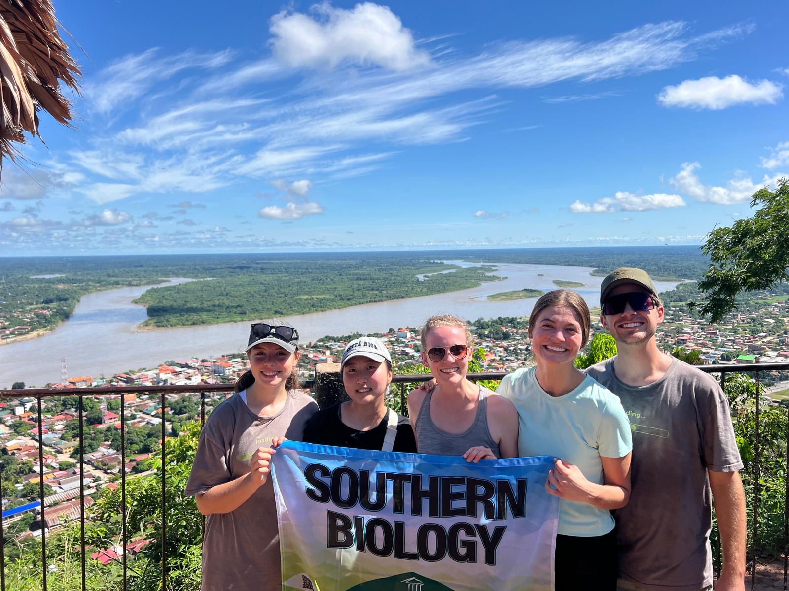 A favorite hike of the locals of Rurrenabaque, Bolivia, and student missionaries at Familia Feliz, the hike to the cross "Mirador de la Cruz" never fails to amaze with its beautiful view of this small town. During Spring Break 2025, a group of former and current student missionaries reunited while enjoying this beautiful scenery amidst humidity and heat. Featured in this photo is Emilie Updegrave, Minha Yang, Katie-Jane Emde, Emilianne Cross, and Ryan Wolfe.