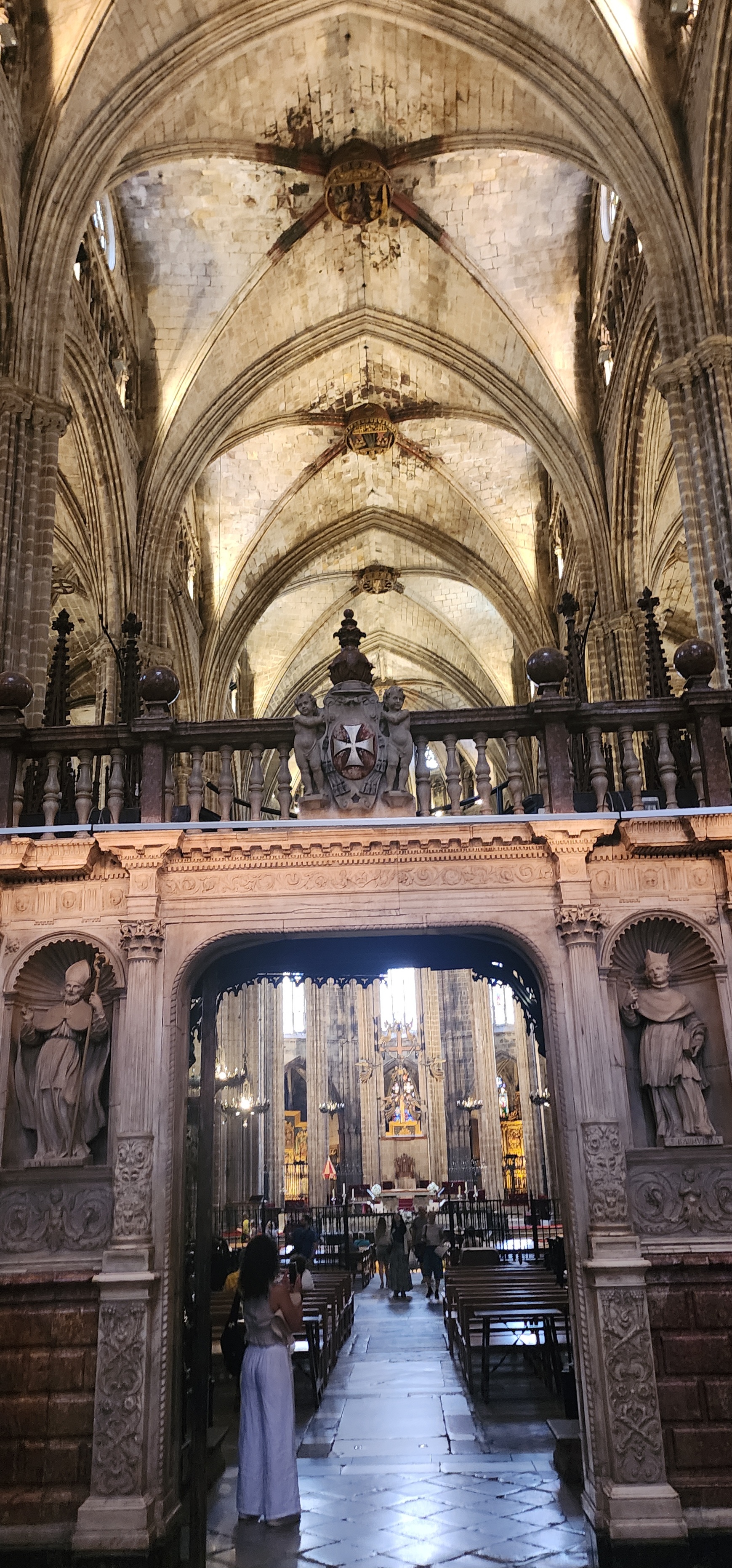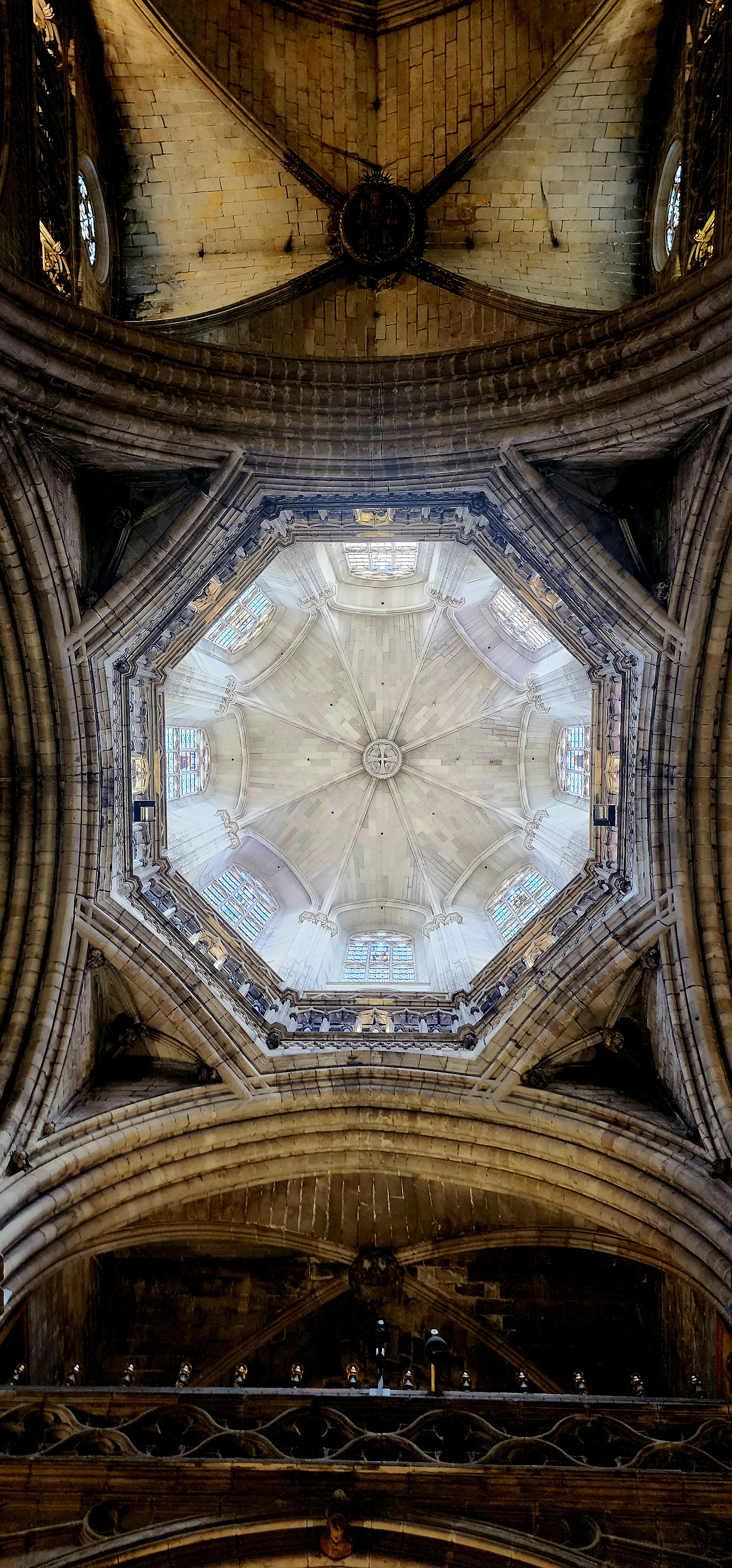 Catedral de Barcelona is known for its Gothic-style architecture. The Cathedral consists of 3 naves and one apse and an ambulatory. This is the typical structure used in Catalan Gothic constructions, which allows for the use of the spaces in-between to have smaller chapels in the Cathedral. There are 2 chapels in each of the naves with 2 large bell towers on both ends without any side chapels. One tower lies above the door of Saint Ivo, while the other is above the entrance to the Cloister. From the terrace of the Cathedral, you can get a close look at the octagonal shape of the bell towers. Large windows adorn the walls of the Cathedral, illuminating the chapels within.
