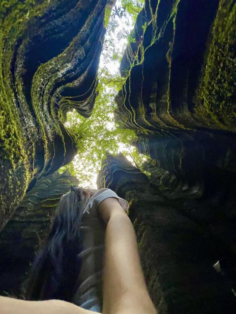 As China’s second-largest stone forest, Suobuya Stone Forest features limestone formations shaped by water over many, many years, revealing distinct horizontal layers. Moss covers the natural walls, highlighting the rock’s clear stratification. The maze of narrow stone corridors and isolated pillars with imaginative shapes make the stone forest feel like frozen in time. Looking up, the blue sky stretches like a flowing river, dotted with leaves, with the rocks forming its natural boundaries.