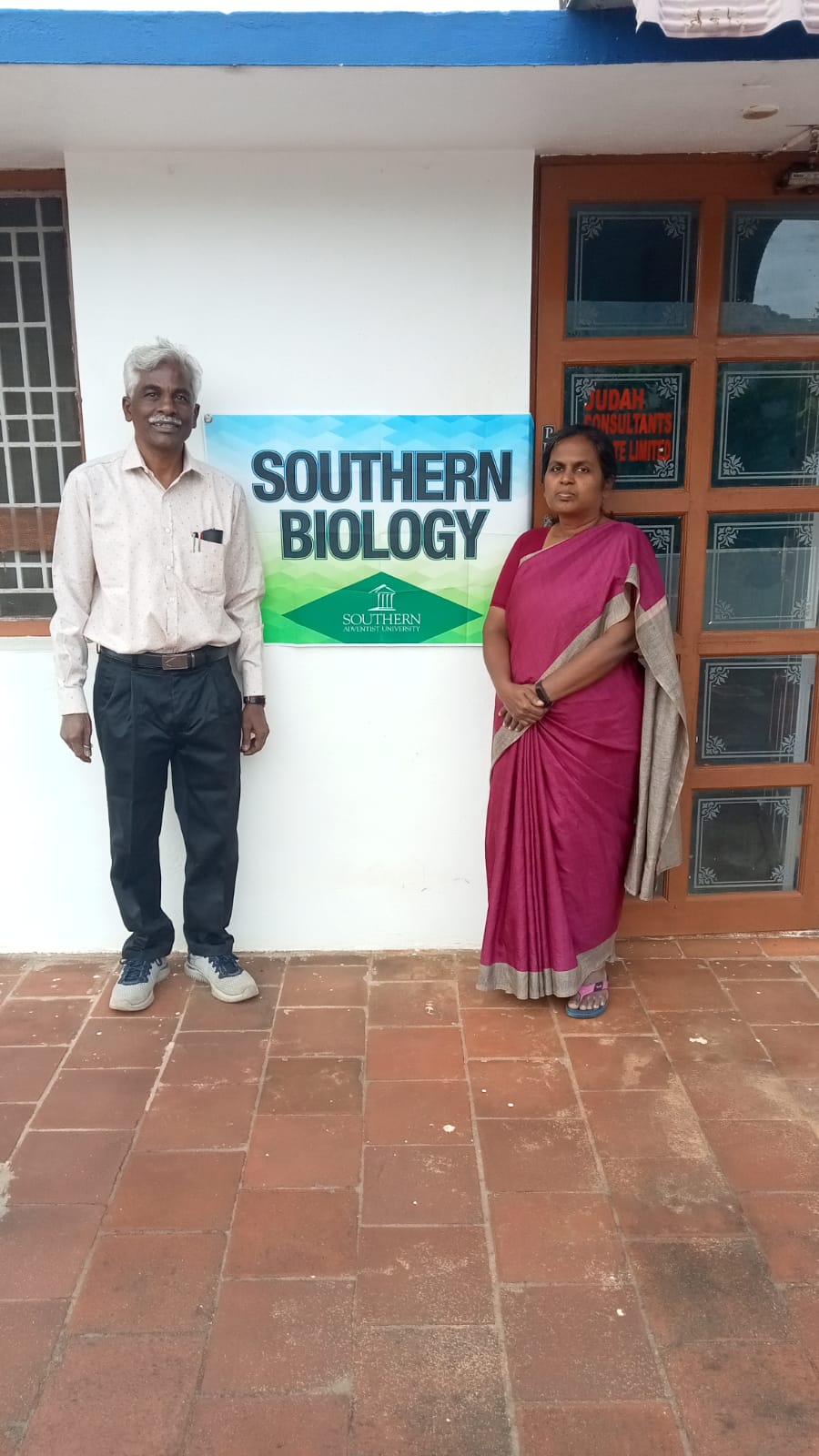 Beena and Asok, sister and brother-in law of Dr. Abhishek, outside of their office where they do property evaluations.