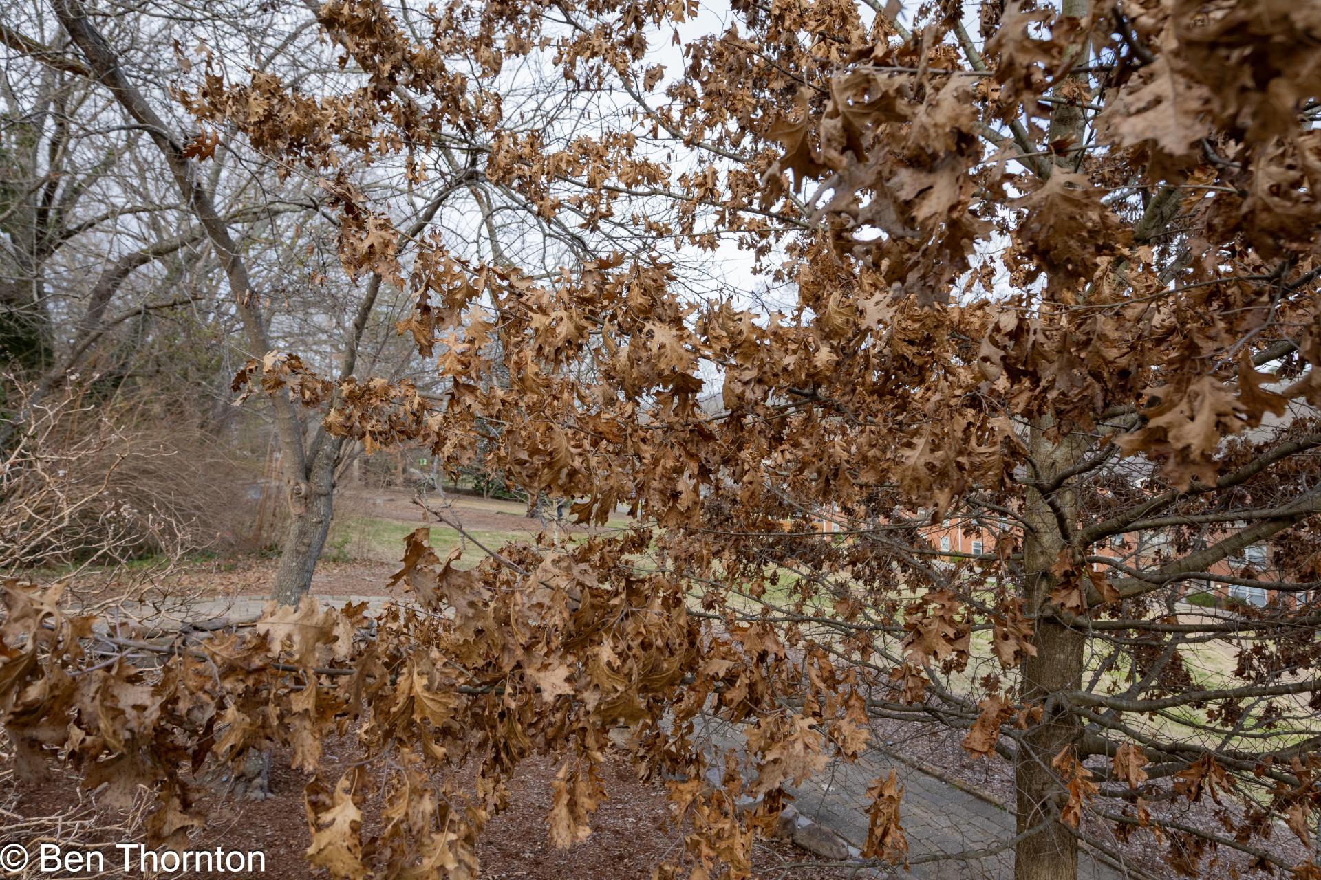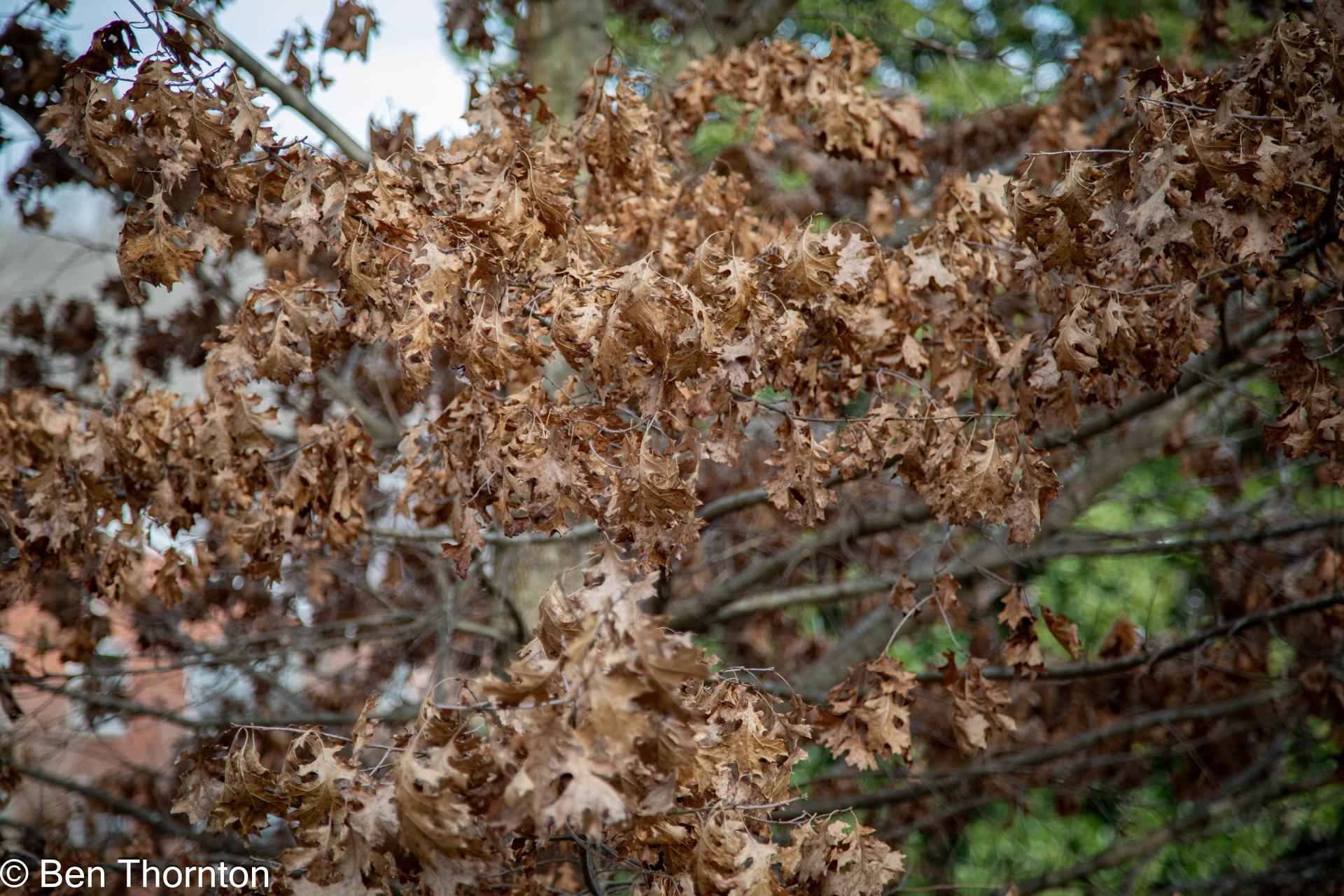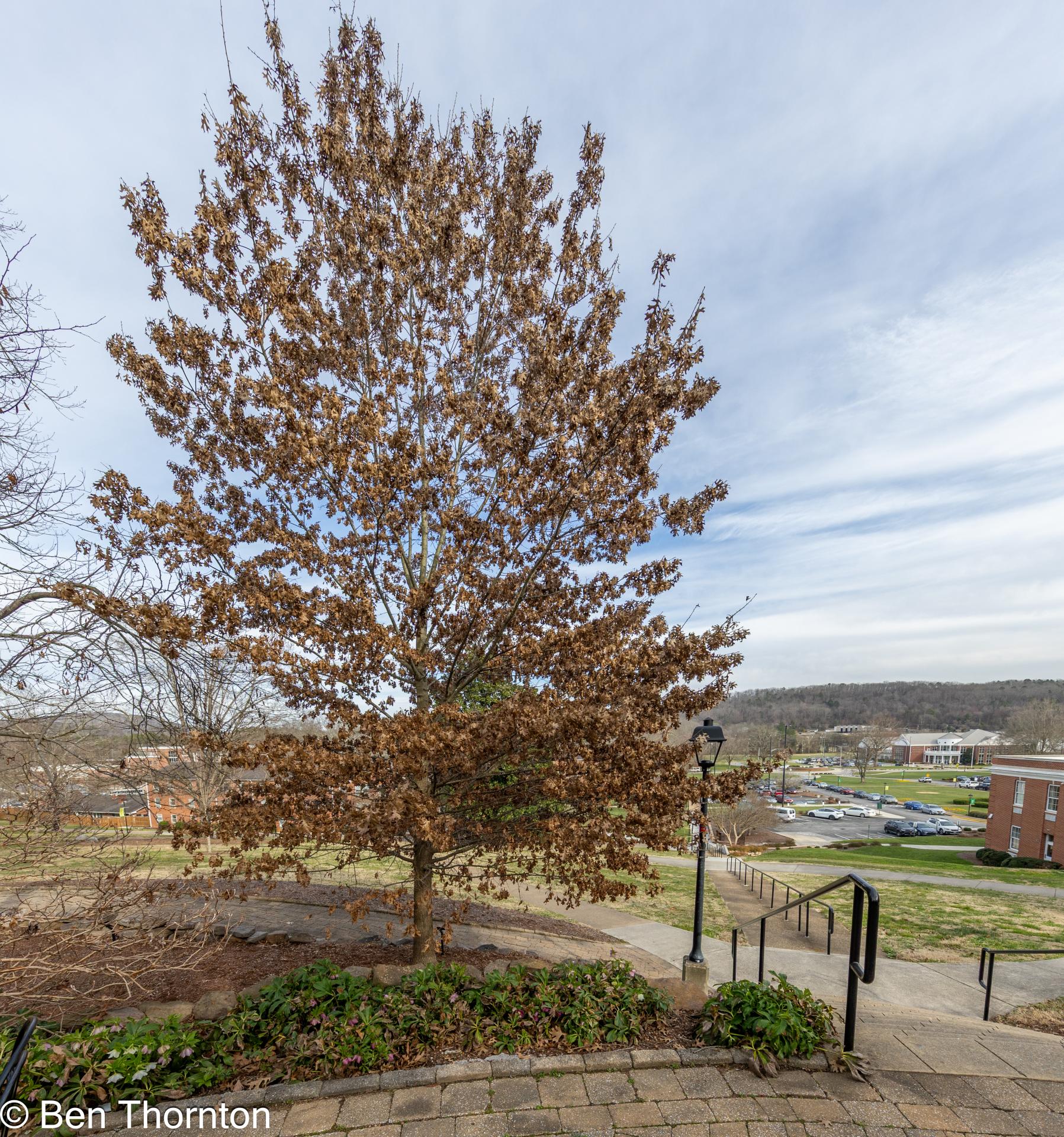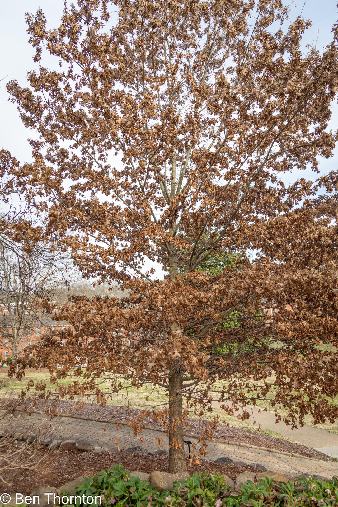 A characteristic shared by a few other oak species, and also some beeches and hornbeams, is the retention of leaves through the winter on juvenile trees, a natural phenomenon referred to as marcescence. Young trees under 6 m (20 ft) are often covered with leaves year-round, though the leaves die in the fall, remaining attached to the shoots until the new leaves appear in the spring. As with many other oak species, dead pin oak branches stay on the tree for many years.[6][7]