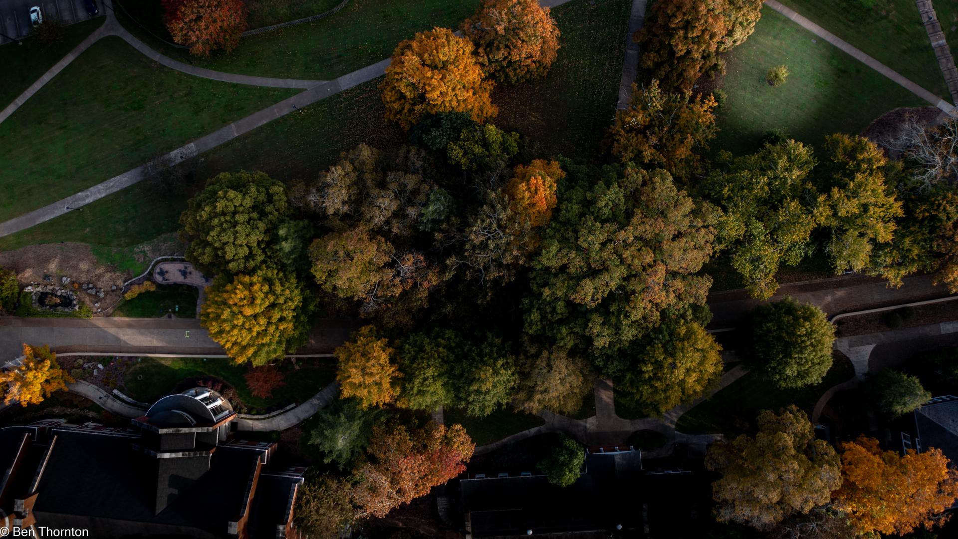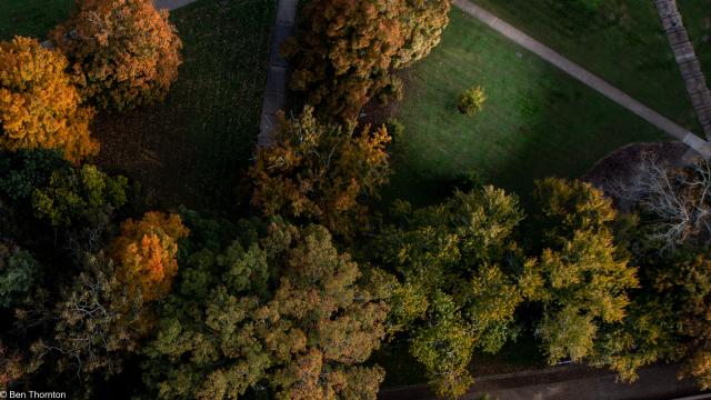 The LEAVES are deciduous, up to 20 cm (7.9 in) long and wide,[8] palmate, with five lobes and borne in opposite pairs. The basal lobes are relatively small, while the upper lobes are larger and deeply notched. In contrast with the angular notching of the SILVER MAPLE, however, the notches tend to be rounded at their interior. The fall color is often spectacular, ranging from bright yellow on some trees through orange to fluorescent red-orange on others. Sugar maples also have a tendency to color unevenly in fall. In some trees, all colors above can be seen at the same time. They also share a tendency with RED MAPLES for certain parts of a mature tree to change color weeks ahead of or behind the remainder of the tree. The leaf buds are pointy and brown-colored. The recent year's growth twigs are green, and turn dark brown.[CITATION NEEDED]