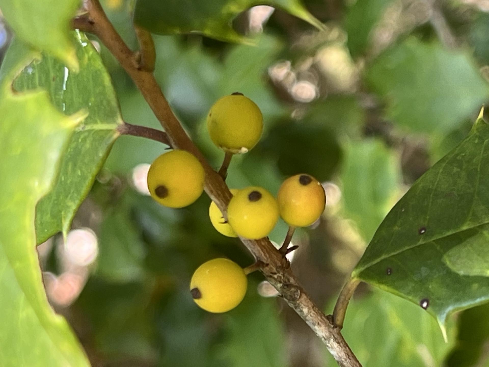 Thefruitis a small reddrupe6–12mm diameter containing fourseeds; it is often persistent into winter.[2][5][6]Branch full of ripe fruitTheflowersare greenish white, small, borne in late spring in shortpedunculatecymesfrom theaxilsof young leaves or scattered along the base of young branches. The calyx is small, four-lobed,imbricatein the bud, acute, marginsciliate, persistent. Thecorollais white, with four petal-like lobes united at the base,obtuse, spreading,hypogynous,imbricatein bud. The flower stem is hairy with a minutebractat base. Like allhollies, it isdioecious, with separate male and female plants; only female plants produce the characteristic red berries. One male canpollenizeseveral females. Male flowers have fourstamens, inserted on the base of the corolla, alternate with its lobes;filamentsawl-shaped, exserted in the sterile, much shorter in the sterile flower;anthersattached at the back, oblong,introrse, two-celled, cells opening longitudinally. Thepistilon female flowers has asuperior ovary, four-celled,rudimentaryinstaminateflowers;stylewanting,stigmasessile, four-lobed; ovules one or two in each cell.
