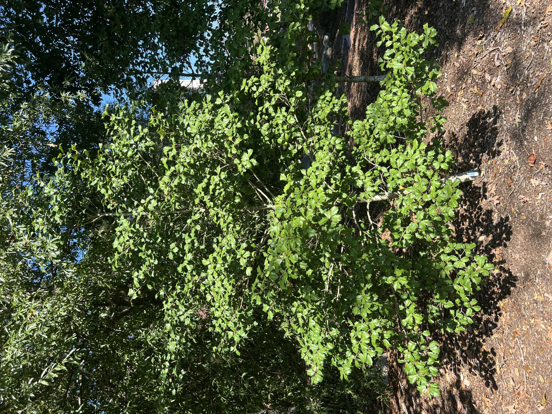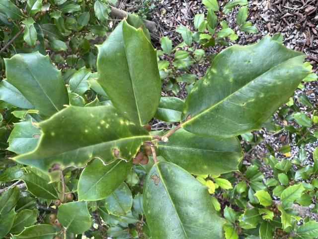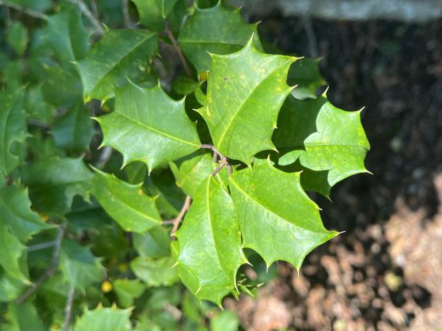Theleavesarealternate, 5–7.5cm (2.0–3.0in) long and 2–4cm (0.79–1.57in) wide, stiff, yellow green and dull matte to sub-shiny above (distinctly less glossy than the otherwise fairly similar European hollyIlex aquifolium[4]), often pale yellow beneath; the edges are curved into several sharp, spike-like points, and a wedge-shaped base andacute apex; themidribis prominent and depressed, the primary veins conspicuous; thepetioleis short, stout, grooved, thickened at base, with a pair of minutestipules. The leaves remain on the branches for two to three years, finally falling in the spring when pushed off by growing buds.[2][5][6]