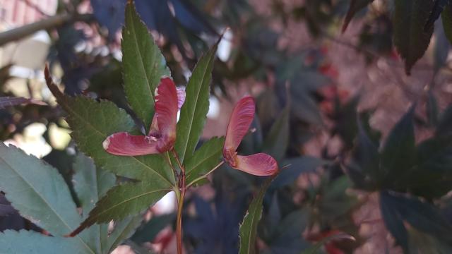 Acer palmatum is deciduous, with the growth habit of a shrub or small tree reaching heights of 6 to 10 m (20 to 33 ft), rarely 16 m (52 ft), reaching a mature width of 4.5 to 10 m (15 to 33 ft),[8] often growing as an understory plant in shady woodlands. It may have multiple trunks joining close to the ground. In habit, its canopy often takes on a dome-like form, especially when mature.[9] The leaves are 4–12 cm (1+1⁄2–4+3⁄4 in) long and wide, palmately lobed with five, seven, or nine acutely pointed lobes. The flowers are produced in small cymes, the individual flowers with five red or purple sepals and five whitish petals. The fruit is a pair of winged samaras, each samara 2–3 cm (3⁄4–1+1⁄4 in) long with a 6–8 mm (1⁄4–5⁄16 in) seed. The seeds of Acer palmatum and similar species require stratification in order to germinate.[9][10]