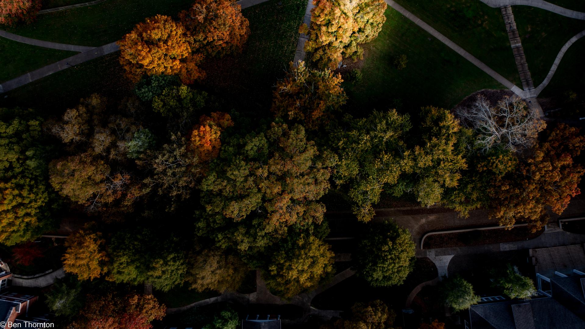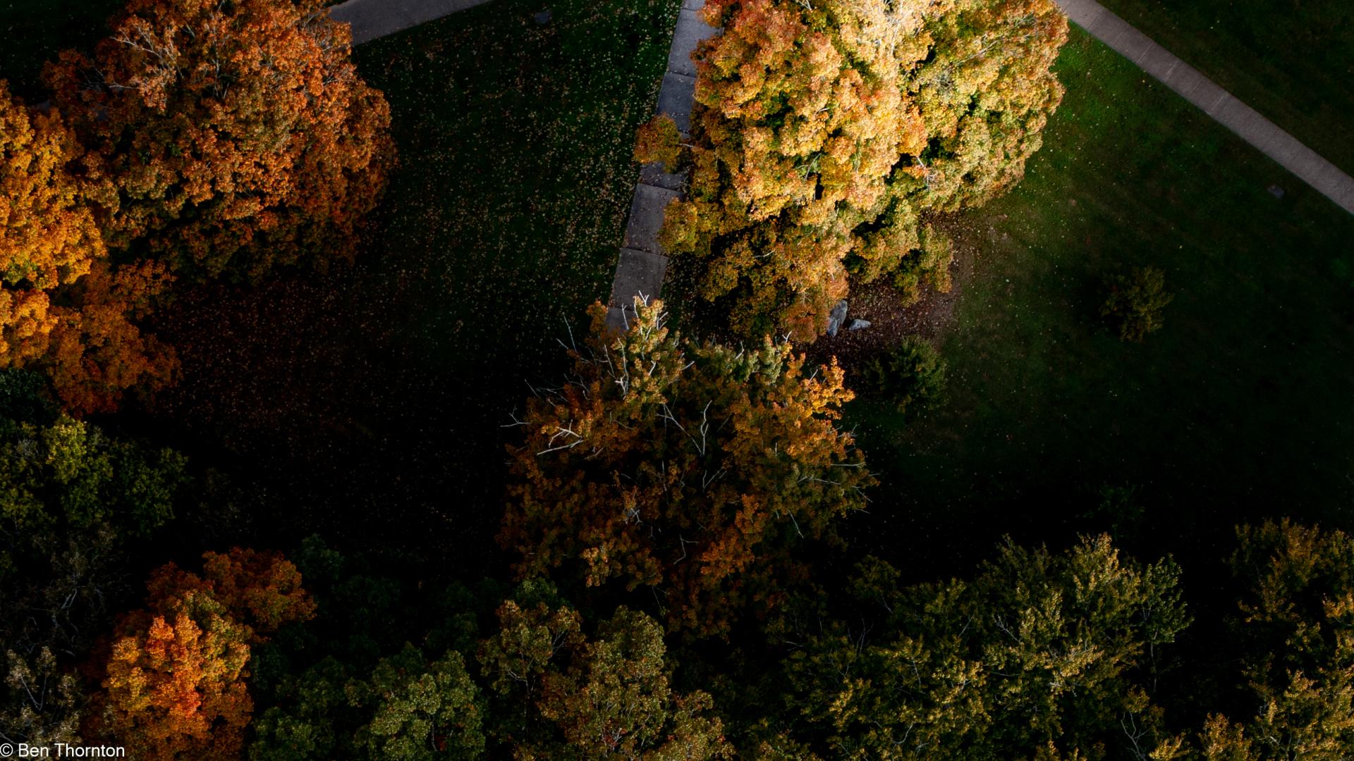 The LEAVES are deciduous, up to 20 cm (7.9 in) long and wide,[8] palmate, with five lobes and borne in opposite pairs. The basal lobes are relatively small, while the upper lobes are larger and deeply notched. In contrast with the angular notching of the SILVER MAPLE, however, the notches tend to be rounded at their interior. The fall color is often spectacular, ranging from bright yellow on some trees through orange to fluorescent red-orange on others. Sugar maples also have a tendency to color unevenly in fall. In some trees, all colors above can be seen at the same time. They also share a tendency with RED MAPLES for certain parts of a mature tree to change color weeks ahead of or behind the remainder of the tree. The leaf buds are pointy and brown-colored. The recent year's growth twigs are green, and turn dark brown.[CITATION NEEDED]