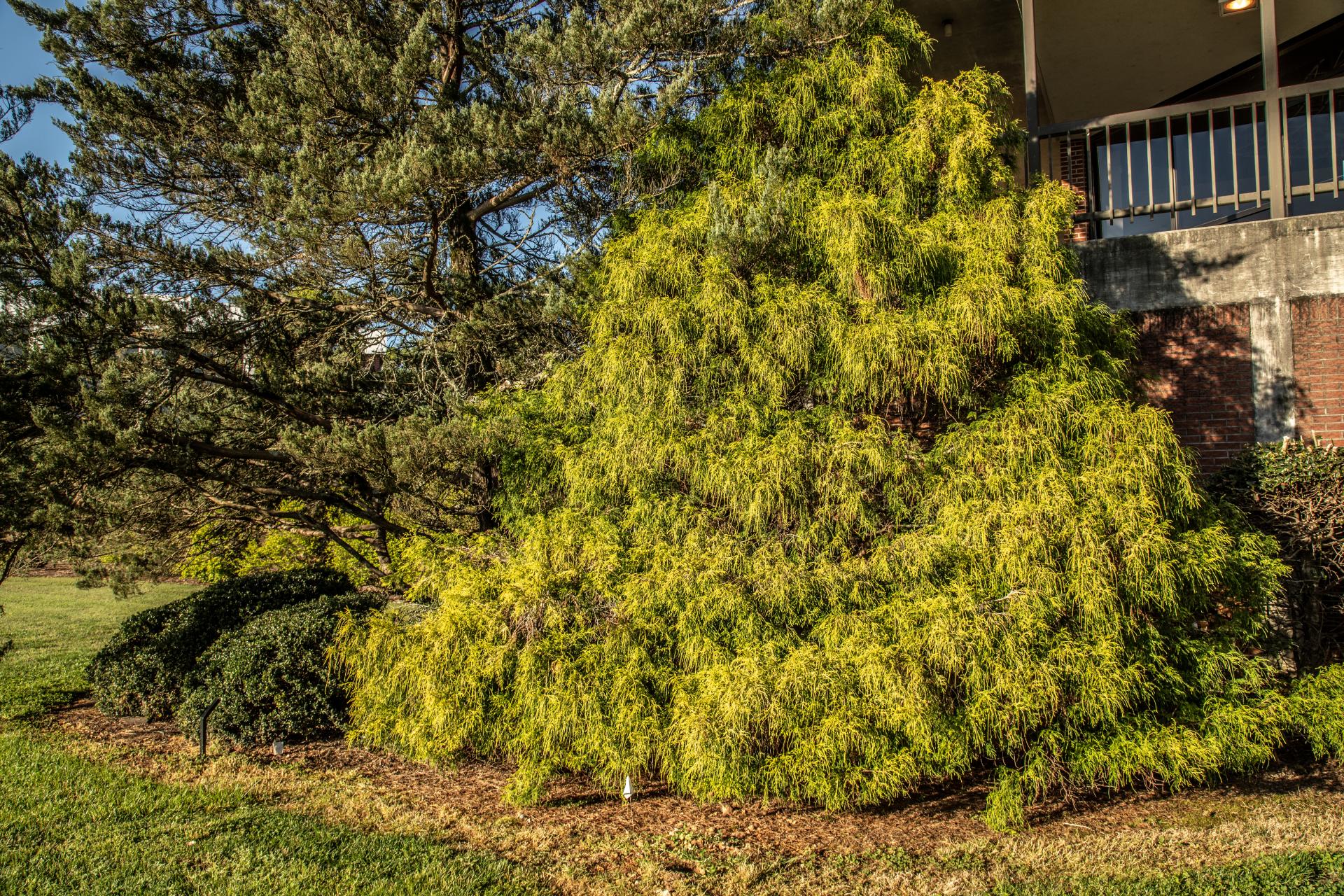Golden thread-leaf Sawara false-cypress is a semi-dwarf, evergreen shrub in the cypress family (Cupressaceae) that is broadly cone shaped and slow growing. It often grows to only 6 to 7 feet tall and 3 feet wide after 20 years but, under ideal conditions, can eventually reach 20 feet in height and 7 feet in width. The species is native to Japan, and this cultivar originated as a sport with golden needles found on C. pisifera 'Filifera,' a cultivar with thread-like, drooping shoots. The genus name derives from the Greek words chamai, for dwarf or low to the ground, and kyparissos, for "cypress." The species epithet, pisifera, is Latin meaning “pea-bearing” and refers to the small rounded cones borne by this plant.