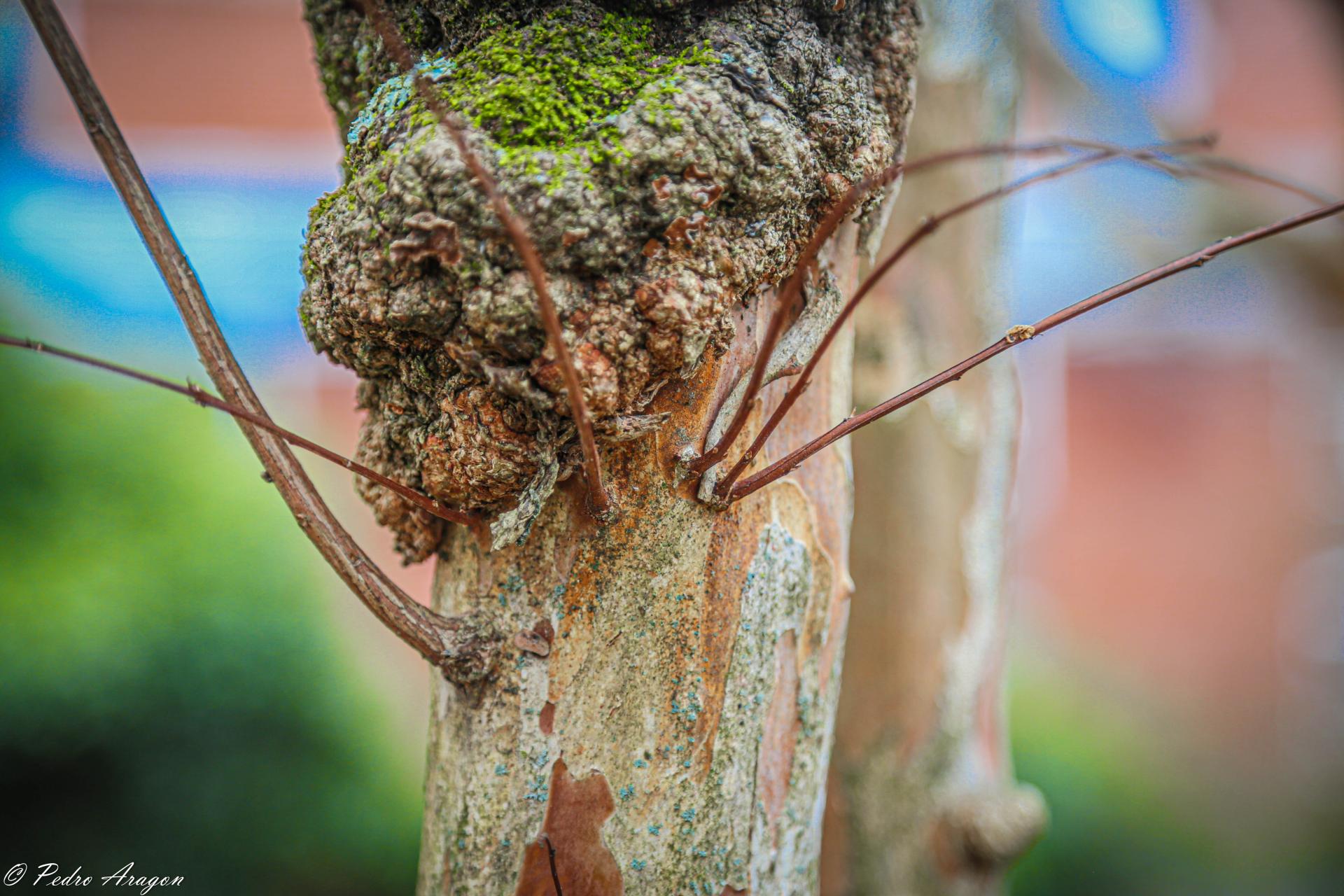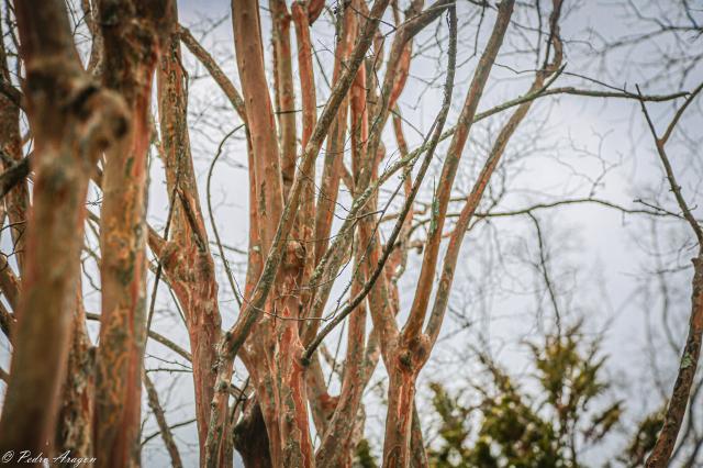 The bark is thin and about 2mm. thick, smooth, pinkish-gray and mottled, shedding each year. Leaves also shed each winter, after spectacular color display, and bare branches re-leaf early in the spring; leaves are small, smooth-edged, circular or oval-shaped, and dark green changing to yellow and orange and red in autumn.