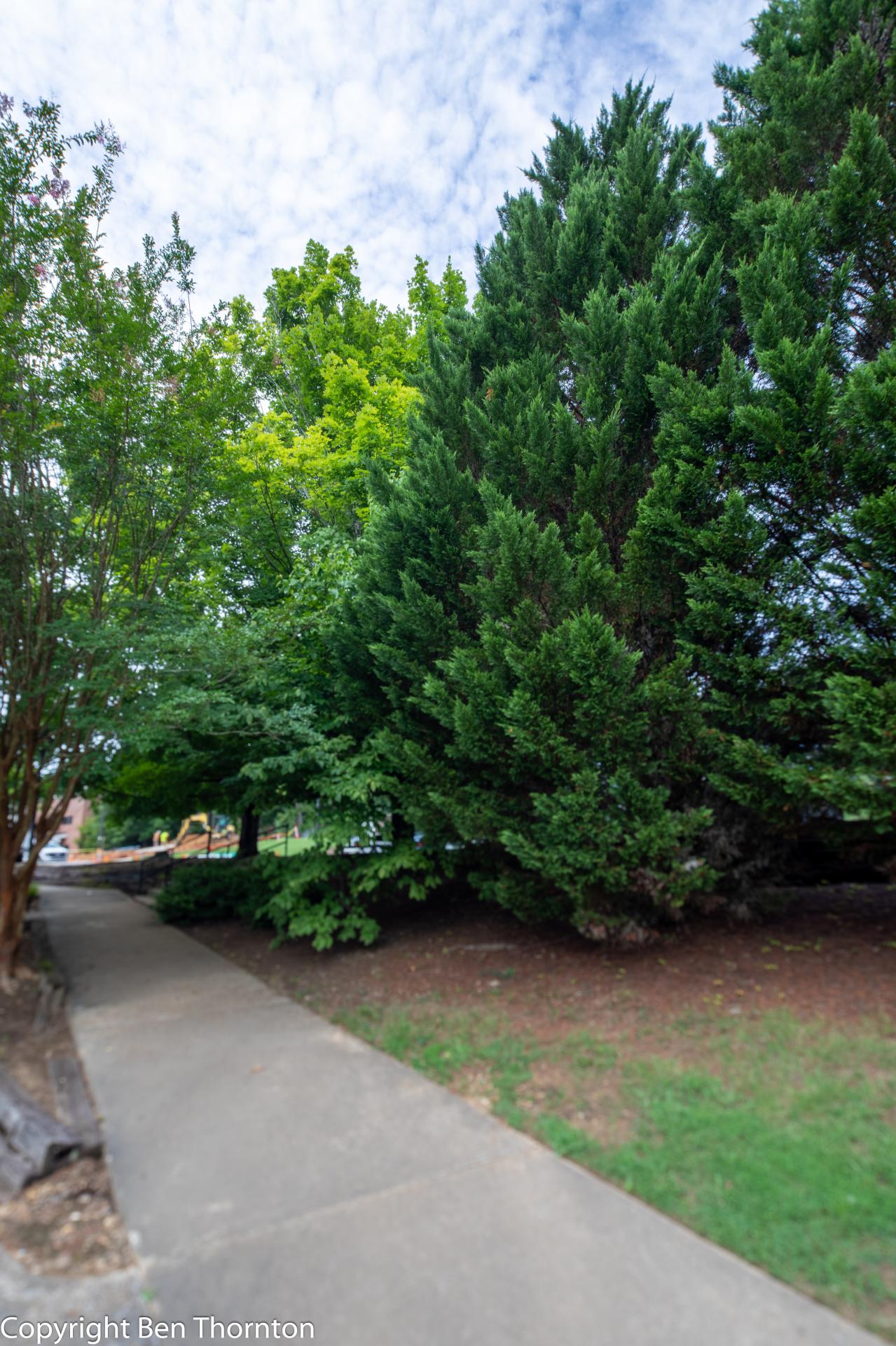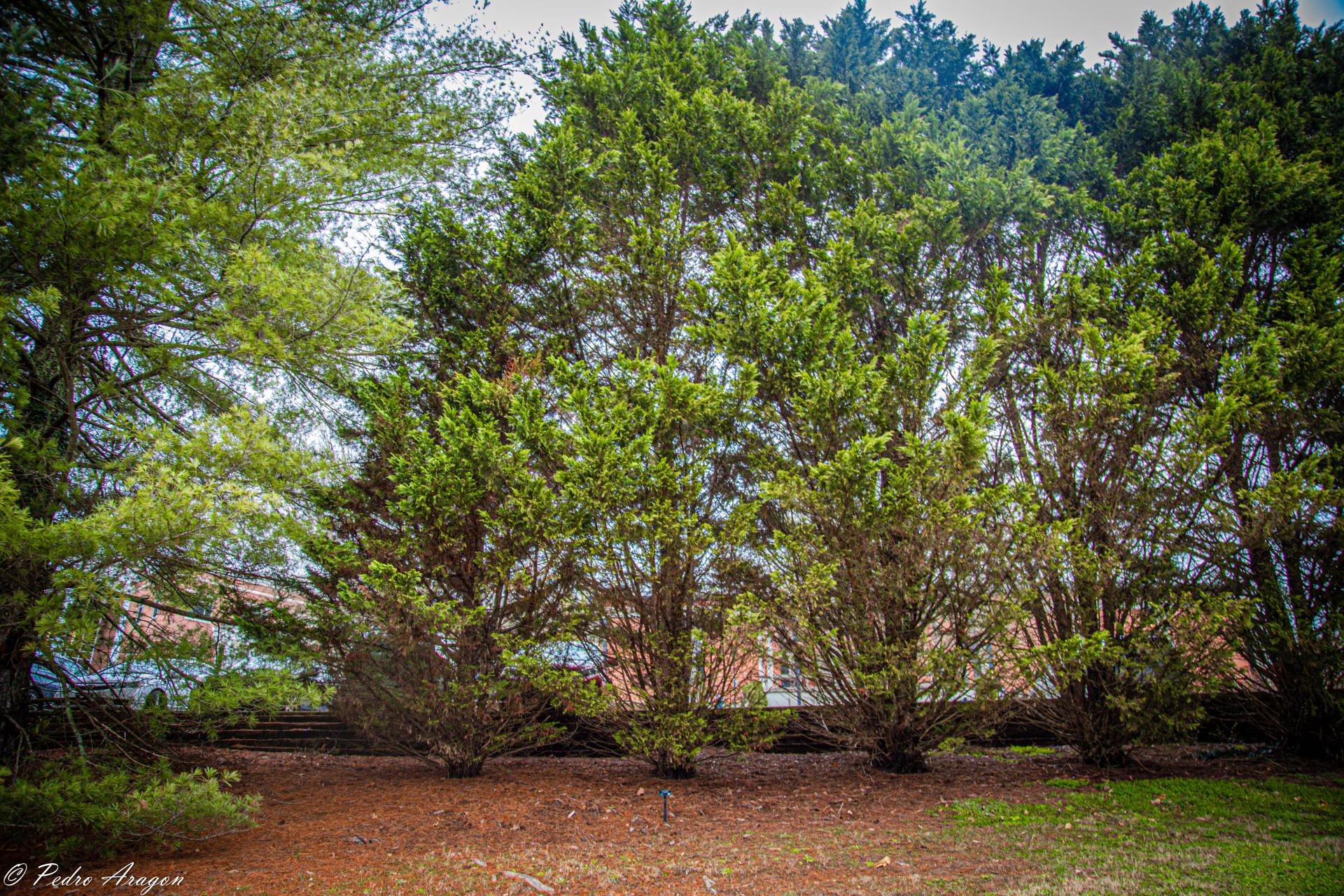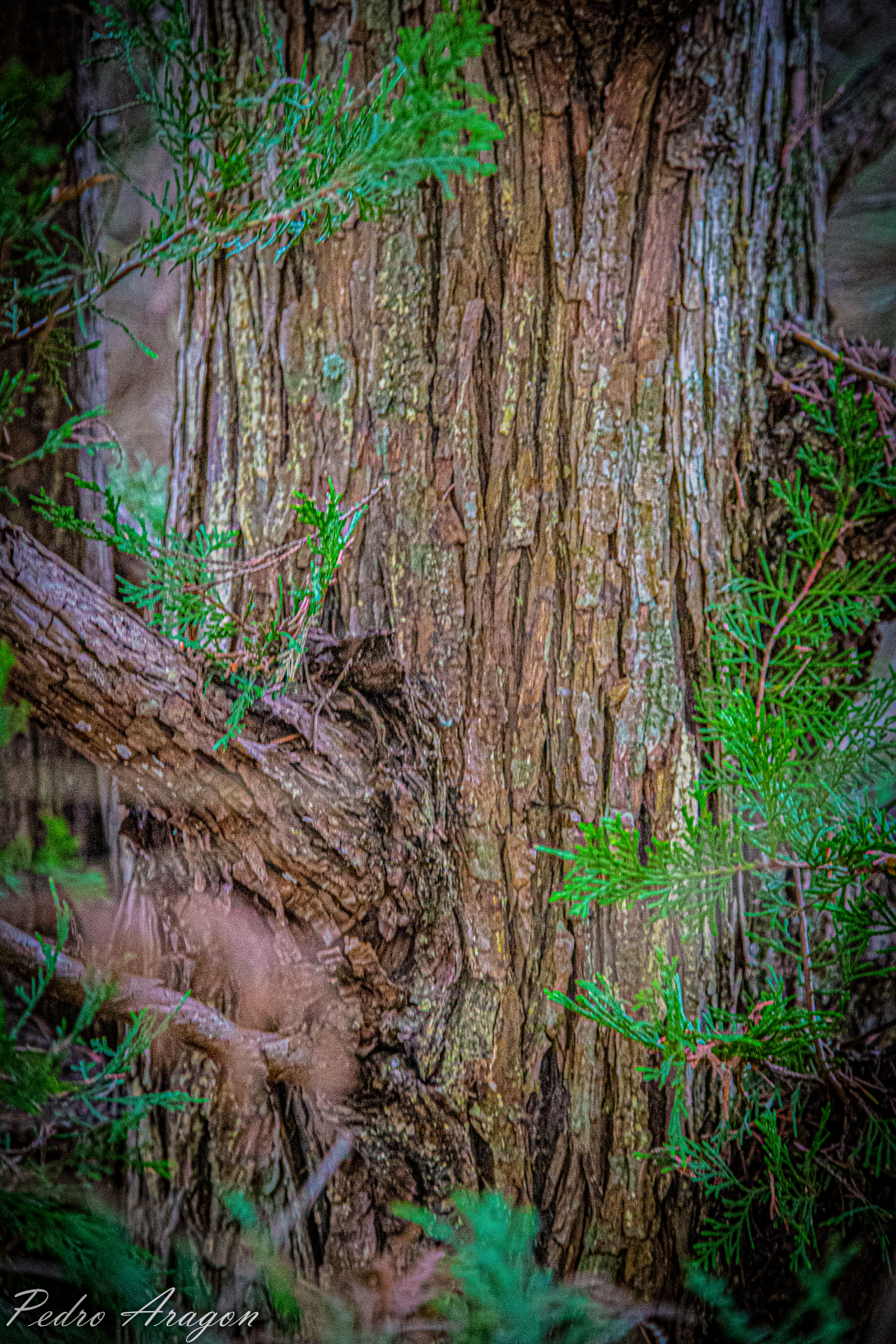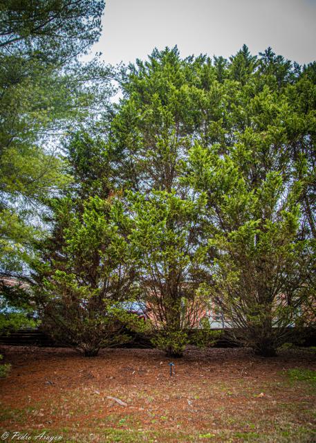 A large, evergreen tree, Cupressus × leylandii reaches a size between 20 and 25 m high, with its leaves giving it a compact, thick and regular habit. It grows very fast with yearly increases of 1 m. The leaves, about 1 mm long and close to the twig, are presented in flaky, slightly aromatic branches. They are dark green, somewhat paler on the underside, but can have different colors, depending on the cultivar. The crown of many forms is broadly columnar with slightly overhanging branch tips. The branches are slightly flattened and densely populated with scaly needles. The tree bark is dark red or brown and has deep grooves.
