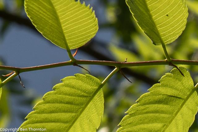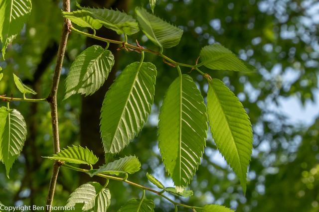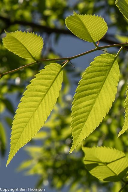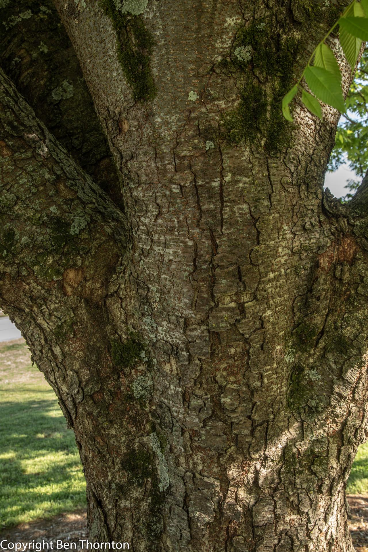 To identify Zelkova serrata, one would look for a short main trunk, low branching and a vase-shaped habit. The twigs are slender with small, dark conical buds in a zigzag pattern. The branches are usually glabrous. The bark is grayish white to grayish brown and either smooth with lenticels or exfoliating in patches to reveal orange inner bark. The branchlets are brownish-purple to brown.