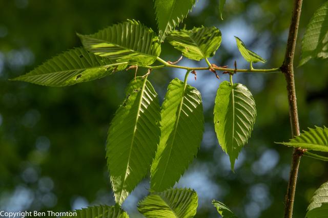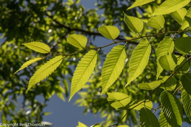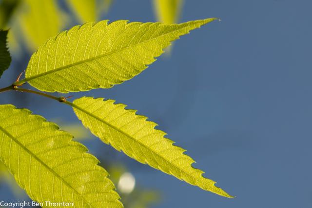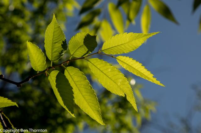 It has alternately arranged leaves growing to 5 cm long and broad. The leaves themselves are simple and ovate to oblong-ovate with serrated or crenate margins, to which the tree owes its specific epithet serrata. The leaves are acuminate or apiculate, rounded or subcordate at the base, and contain 8–14 pairs of veins. The leaves are rough on top and glabrous or nearly glabrous on the underside. They are green to dark green in spring and throughout the summer, changing to yellows, oranges and reds in autumn. The petioles are 2–5 mm (1⁄16–3⁄16 in) long.[6]