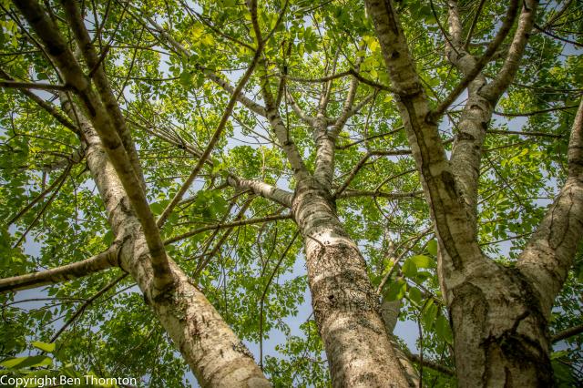 North American native ash tree species are used by North American frogs as a critical food source, as the leaves that fall from the trees are particularly suitable for tadpoles to feed upon in ponds (both temporary and permanent), large puddles, and other water sources.[24] Species such as red maple, which are taking the place of ash due to the ash borer, are much less suitable for the frogs as a food source — resulting in poor frog survival rates and small frog sizes.[24] It is the lack of tannins in the American ash varieties that makes them good for the frogs as a food source and also not resistant to the ash borer. Varieties of ash from outside North America typically have much higher tannin levels and resist the borer. Maples and various non-native invasive trees, trees that are taking the place of American ash species in the North American ecosystem, typically have much higher leaf tannin levels.[24]