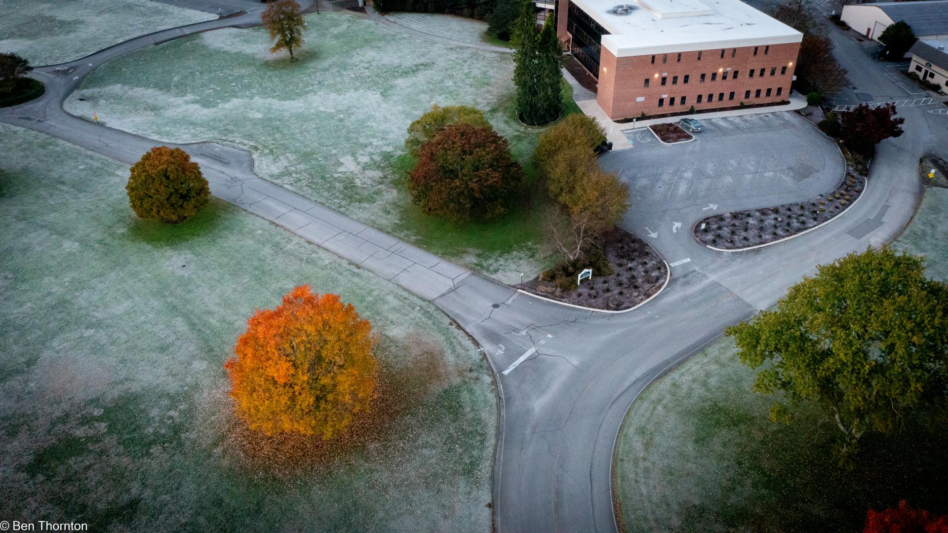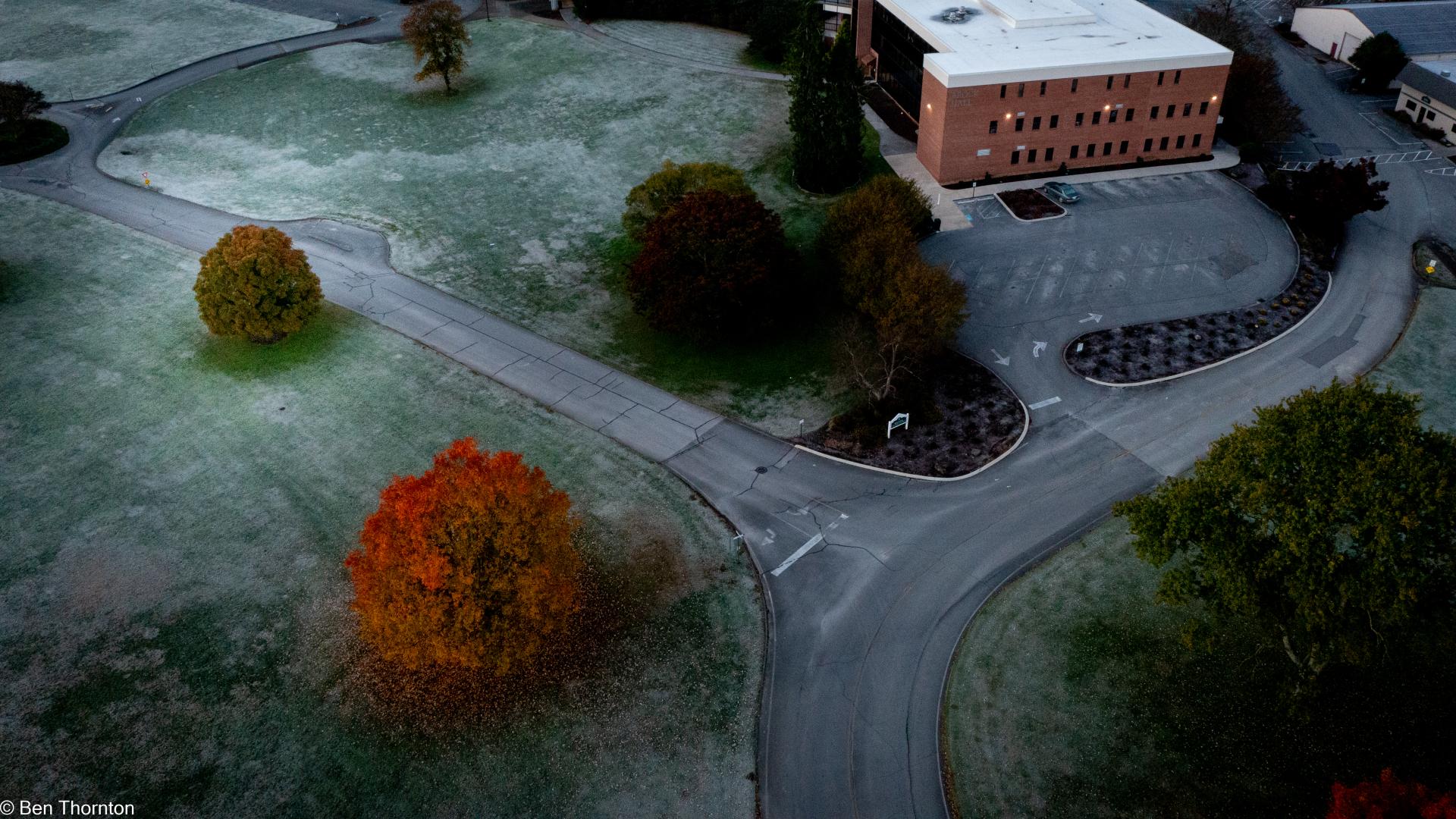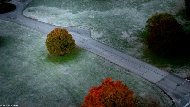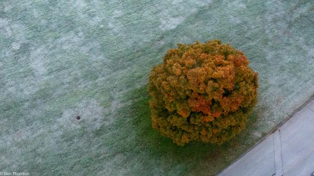 The LEAVES of the red maple offer the easiest way to distinguish it from its relatives. As with all North American maple trees, they are DECIDUOUS and arranged oppositely on the twig. They are typically 5–10 cm (2–4 in) long and wide with three to five PALMATE LOBES with a serrated margin. The SINUSES are typically narrow, but the leaves can exhibit considerable variation.[6] When five lobes are present, the three at the terminal end are larger than the other two near the base. In contrast, the leaves of the related SILVER MAPLE, A. saccharinum, are much more deeply lobed, more sharply toothed, and characteristically have five lobes. The upper side of A. rubrum's leaf is light green and the underside is whitish and can be either GLAUCOUS or hairy. The leaf stalks are usually red and are up to 10 cm (4 in) long. The leaves can turn a characteristic brilliant red in autumn, but can also become yellow or orange on some individuals. Soil acidity can influence the color of the foliage and trees with female flowers are more likely to produce orange coloration while male trees produce red. The FALL COLORS of red maple are most spectacular in the northern part of its range where climates are cooler.