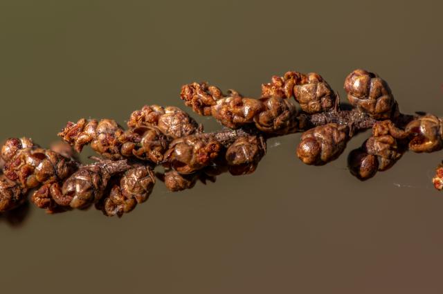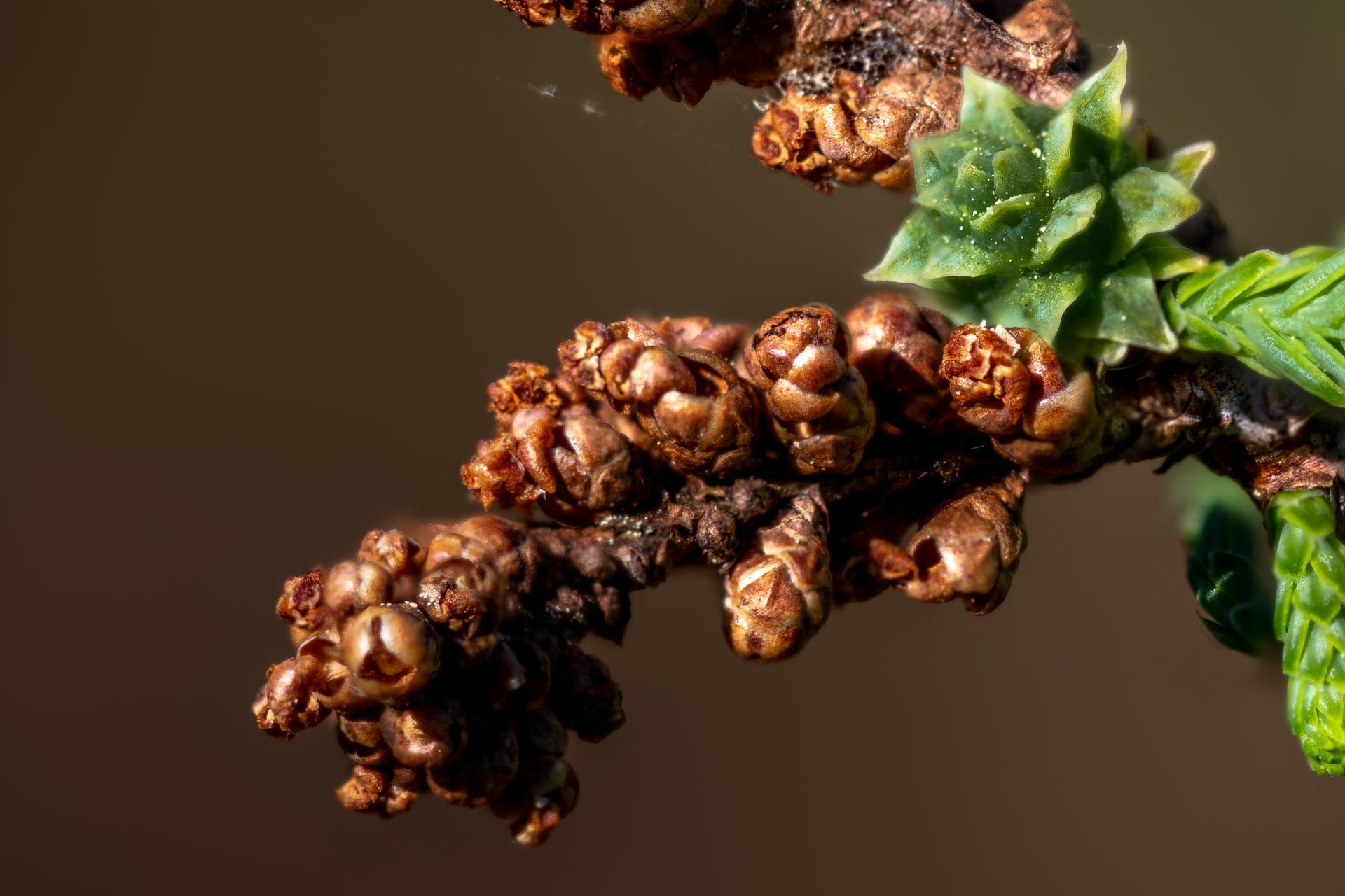This species ismonoecious, with male and female flowers on a single plant forming on slender, tassel-like structures near the edge of branchlets. The tree flowers in April and the seeds ripen in October.[9]The male and femalestrobiliare produced from buds formed in late autumn, with pollination in early winter, and mature in about 12 months. Maleconesemerge onpaniclesthat are 4–5 inches (10–13cm) inches long. Female cones are round,resinousand green while young. They then turn hard and then brown as the tree matures. They are globular and 2.0–3.5cm (3⁄4–13⁄8in) in diameter. They have from 20 to 30 spirally arranged, four-sided scales, each bearing one, two, or rarely three triangularseeds. Each cone contains 20 to 40 large seeds. The cones disintegrate at maturity to release the seeds. The seeds are 5–10mm (3⁄16–13⁄32in) long, the largest of any species of Cupressaceae, and are produced every year, with heavy crops every 3–5 years. The seedlings have three to nine, but usually six,cotyledonseach.[3]