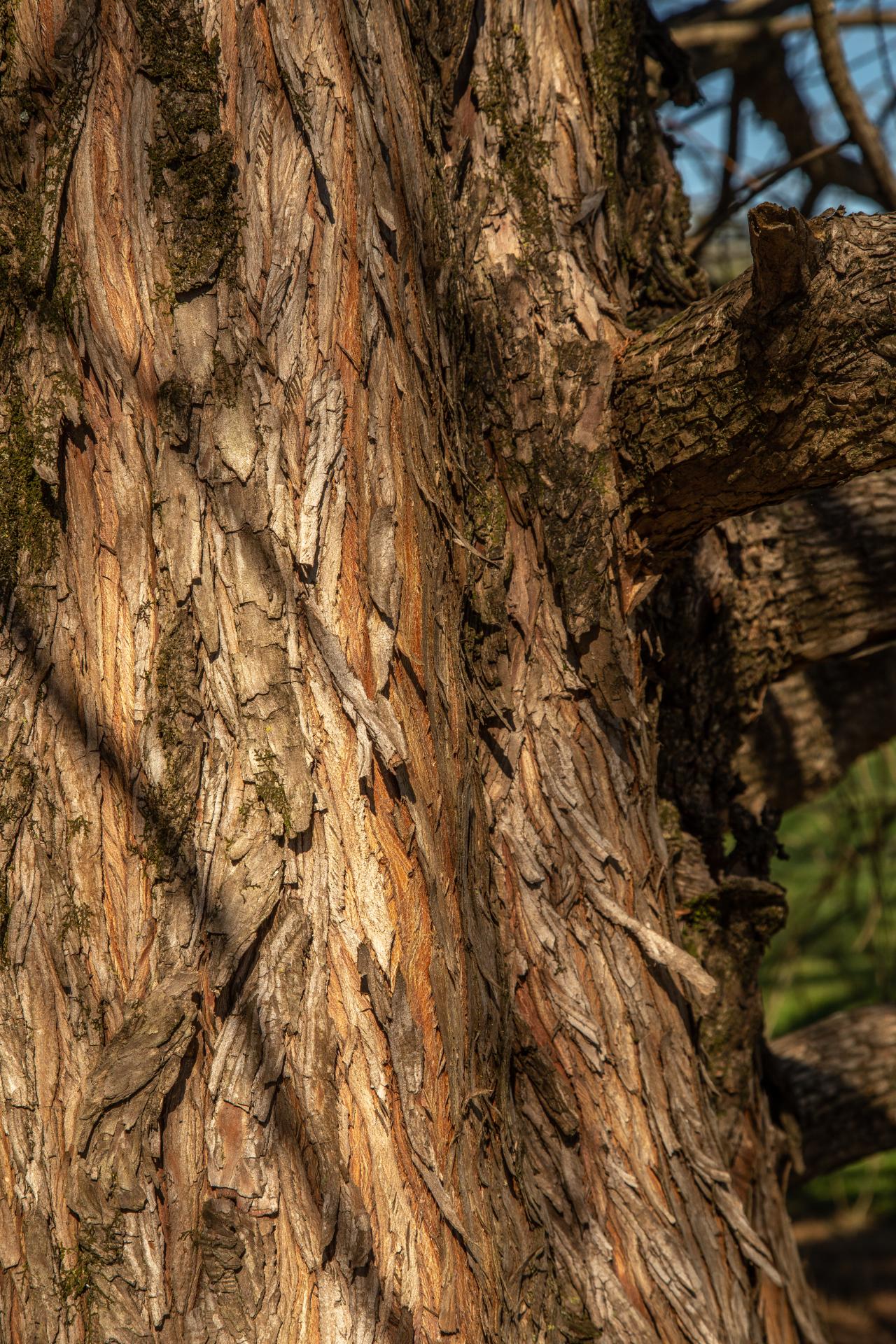 The main trunk is often surrounded bycypress knees. Thebarkis grayish brown to reddish brown, thin, and fibrous with a stringy texture; it has a vertically, interwoven pattern of shallow ridges and narrow furrows.