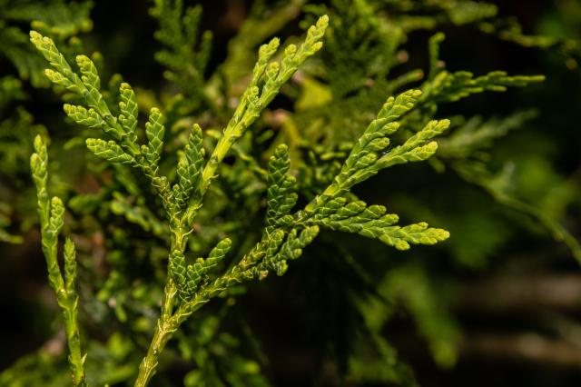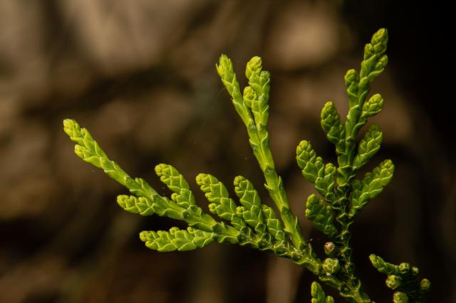 Unlike the closely related western red cedar (Thuja plicata), northern white cedar is only a small or medium-sized tree, growing to a height of 15 m (49 ft) tall with a 0.9 m (3.0 ft) trunk diameter, exceptionally to 38 metres (125 ft) tall and 1.8 metres (5.9 ft) diameter.[7] The tree is often stunted or prostrate in less favorable locations. The bark is red-brown, furrowed and peels in narrow, longitudinal strips. Northern white cedar has fan-like branches and scaly leaves. The foliage forms in flat sprays with scale-like leaves 3–5 millimetres (1⁄8–3⁄16 in) long.