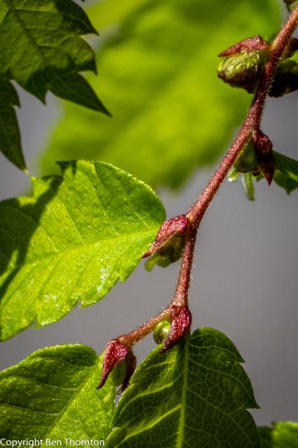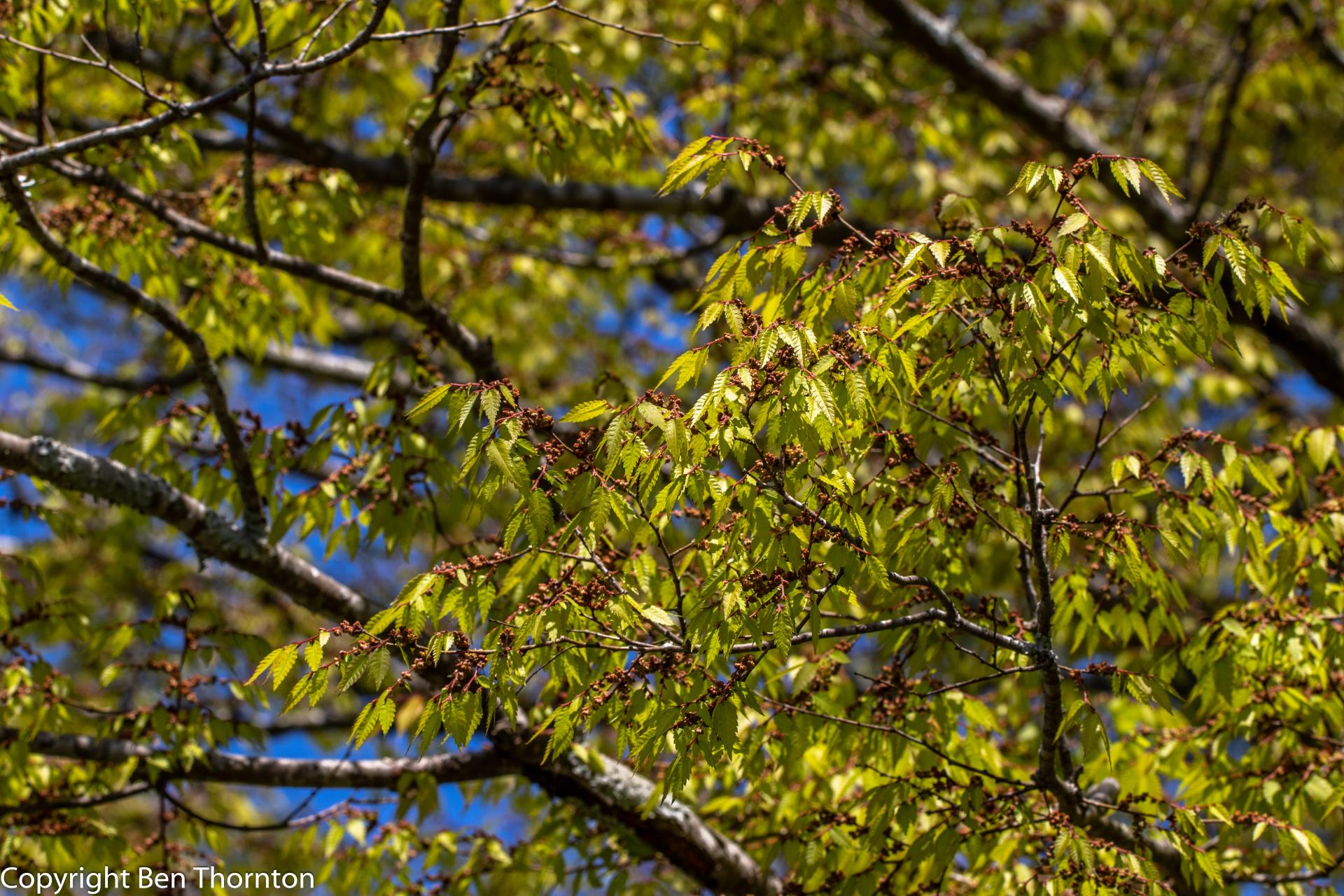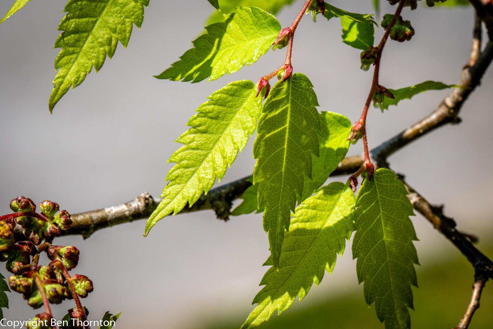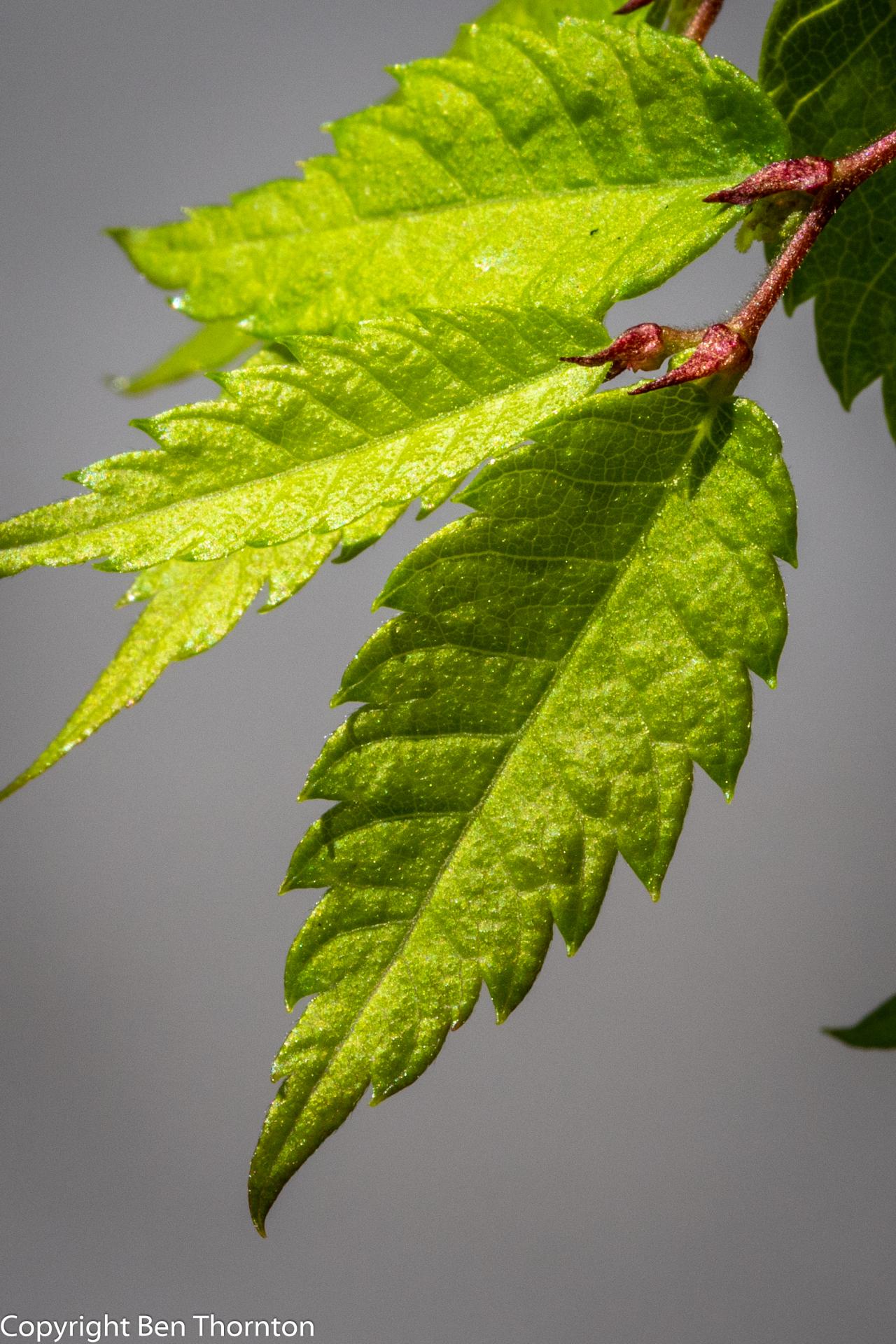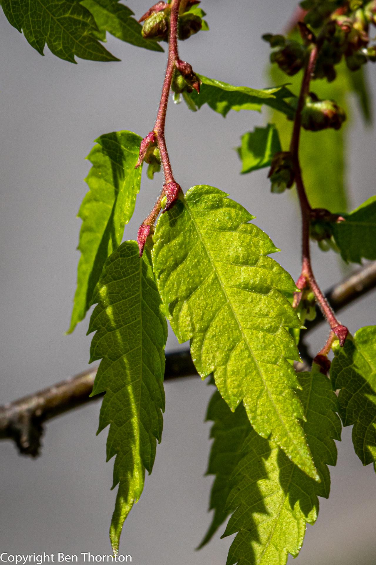 It has alternately arranged leaves growing to 5 cm long and broad. The leaves themselves are simple and ovate to oblong-ovate with serrated or crenate margins, to which the tree owes its specific epithet serrata. The leaves are acuminate or apiculate, rounded or subcordate at the base, and contain 8–14 pairs of veins. The leaves are rough on top and glabrous or nearly glabrous on the underside. They are green to dark green in spring and throughout the summer, changing to yellows, oranges and reds in autumn. The petioles are 2–5 mm (1⁄163⁄16 in) long.[6]