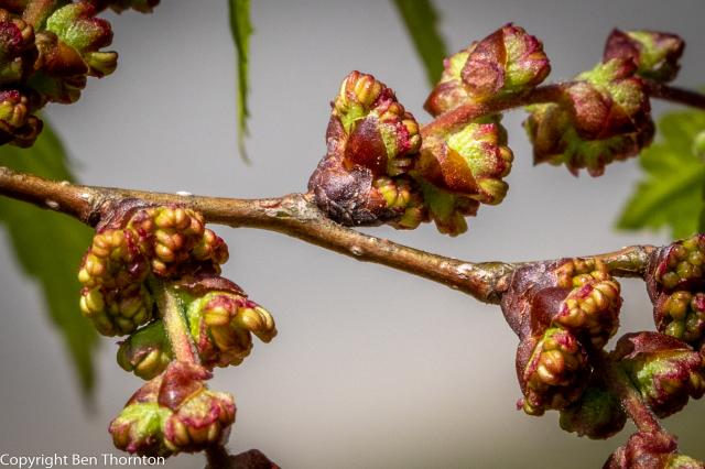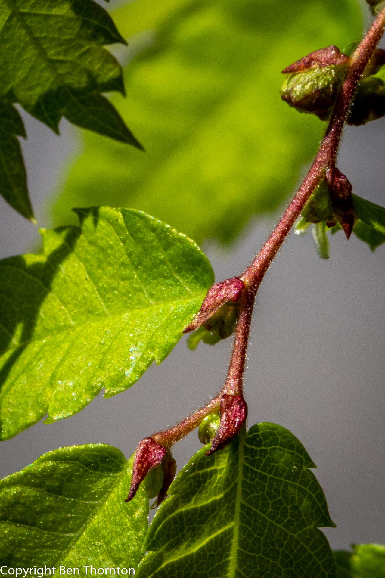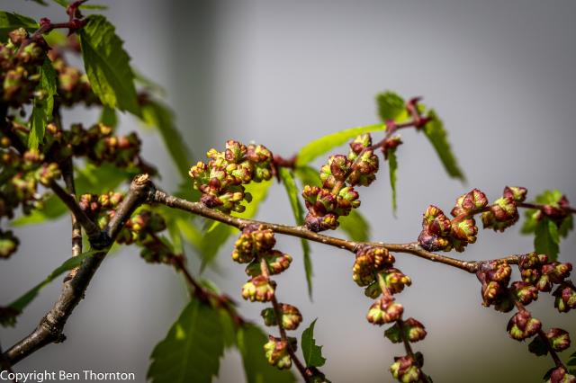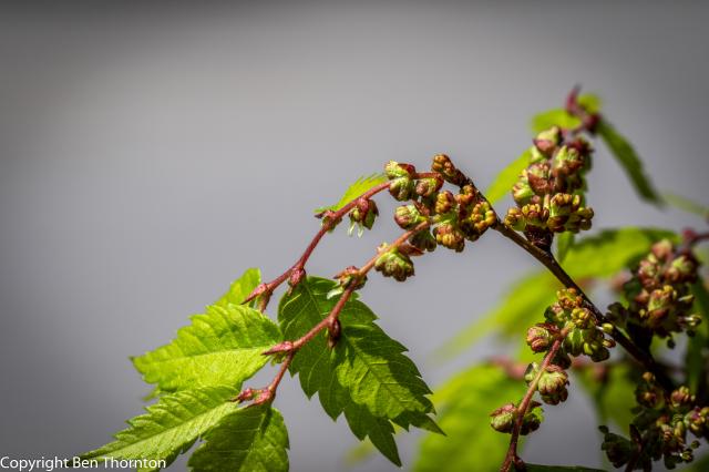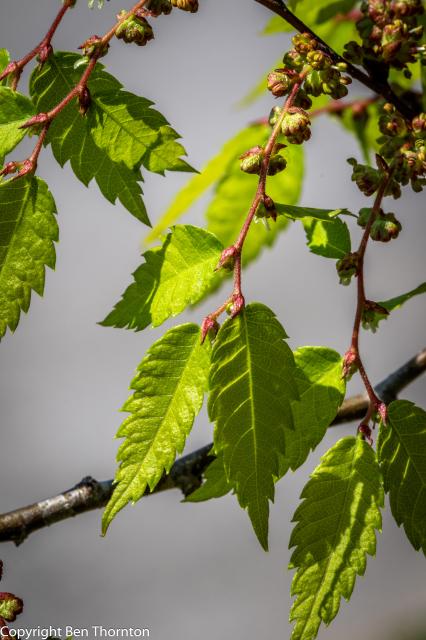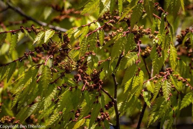 Zelkova serrata is monoecious. It develops flowers in spring with the leaves. Buds are ovoid, acutish, with many imbricate, dark brown scales.[5] They diverge at a 45 degree angle from the stem. The staminate flowers are shortly pedicellate and approximately 3mm in diameter, clustered in the axils of the lower leaves. The pistillate flowers are solitary or few in axils of the upper leaves, sessile and usually about 1.5 mm in diameter. The flowers are yellow-green, not showy, and occur in tight groups along new stems. They give rise to small, ovate, wingless drupes that ripen in late summer to autumn. The drupe is green maturing to brown, subsessile and 2.5 to 3.5 mm (3⁄32 to 1⁄8 in) in diameter.