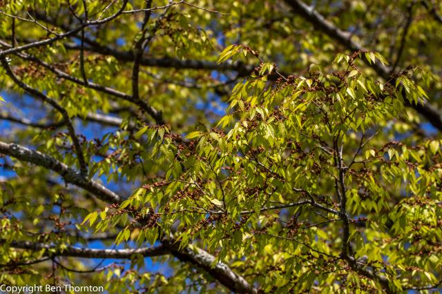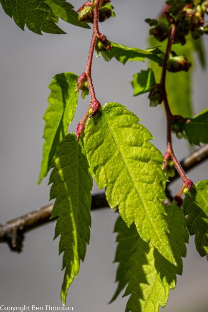 To identify Zelkova serrata, one would look for a short main trunk, low branching and a vase-shaped habit. The twigs are slender with small, dark conical buds in a zigzag pattern. The branches are usually glabrous. The bark is grayish white to grayish brown and either smooth with lenticels or exfoliating in patches to reveal orange inner bark. The branchlets are brownish-purple to brown.