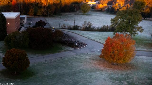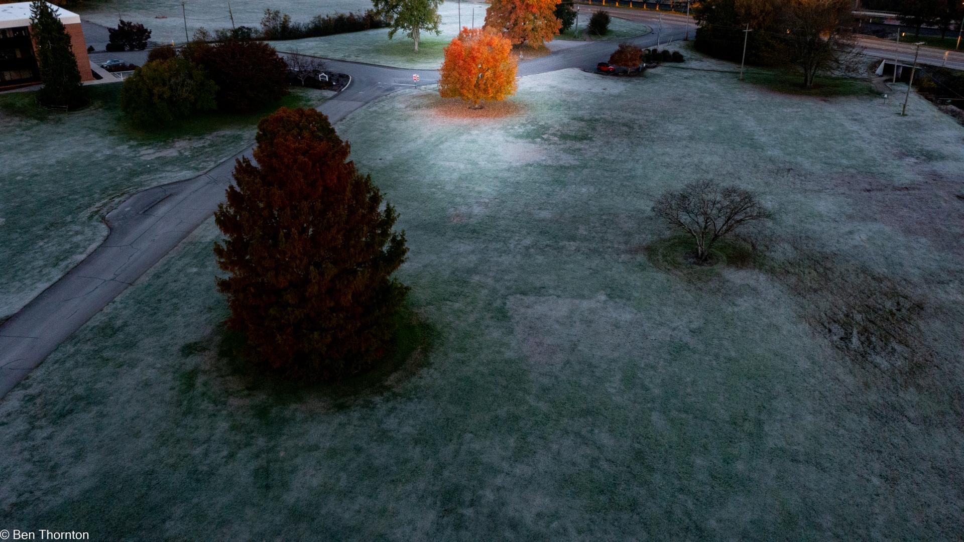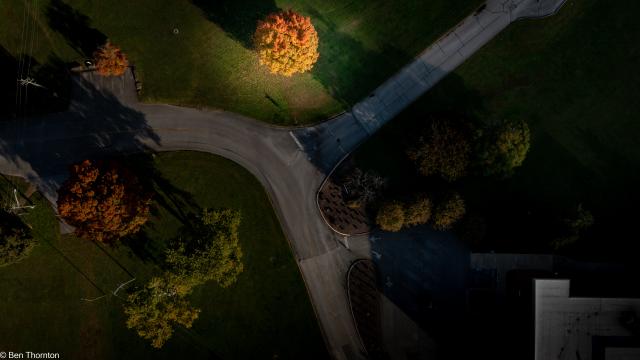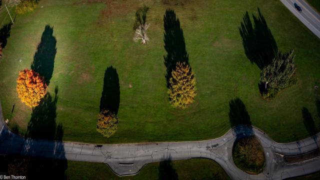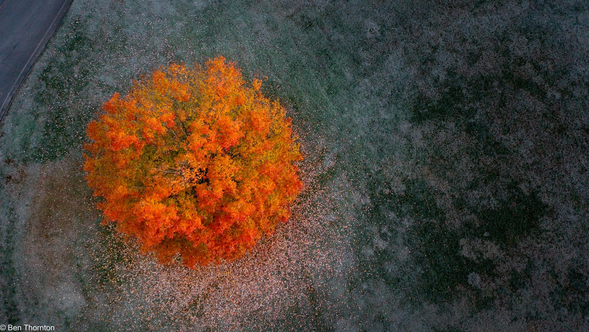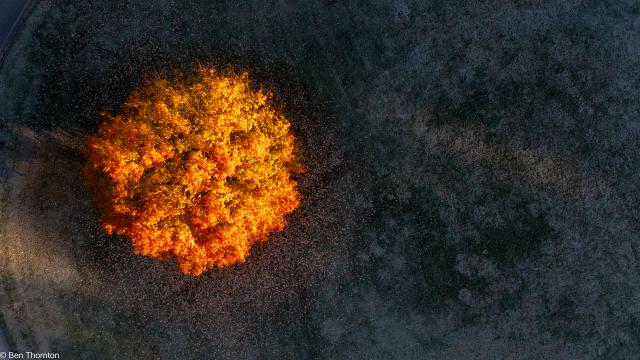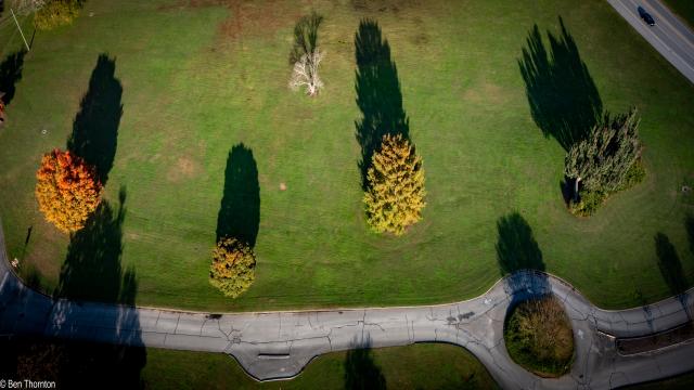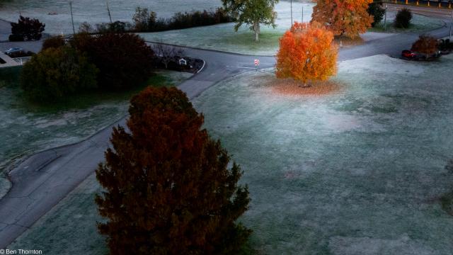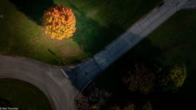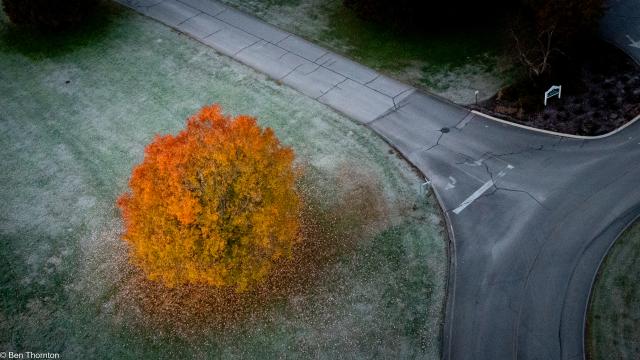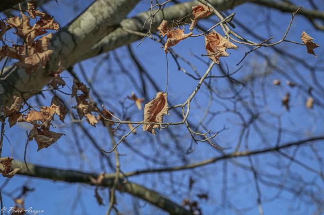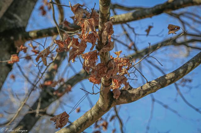 The LEAVES are deciduous, up to 20 cm (7.9 in) long and wide,[8] palmate, with five lobes and borne in opposite pairs. The basal lobes are relatively small, while the upper lobes are larger and deeply notched. In contrast with the angular notching of the SILVER MAPLE, however, the notches tend to be rounded at their interior. The fall color is often spectacular, ranging from bright yellow on some trees through orange to fluorescent red-orange on others. Sugar maples also have a tendency to color unevenly in fall. In some trees, all colors above can be seen at the same time. They also share a tendency with RED MAPLES for certain parts of a mature tree to change color weeks ahead of or behind the remainder of the tree. The leaf buds are pointy and brown-colored. The recent year's growth twigs are green, and turn dark brown.[CITATION NEEDED]