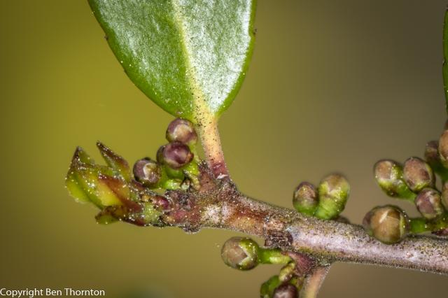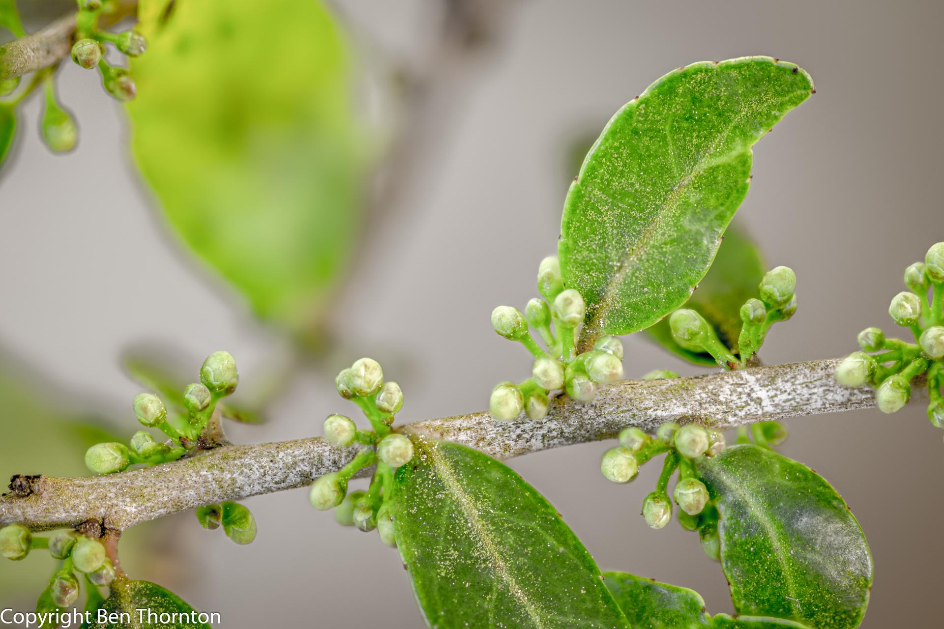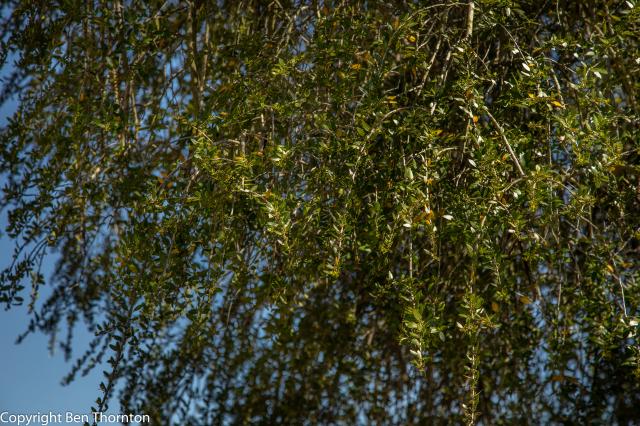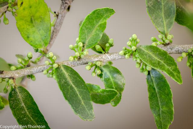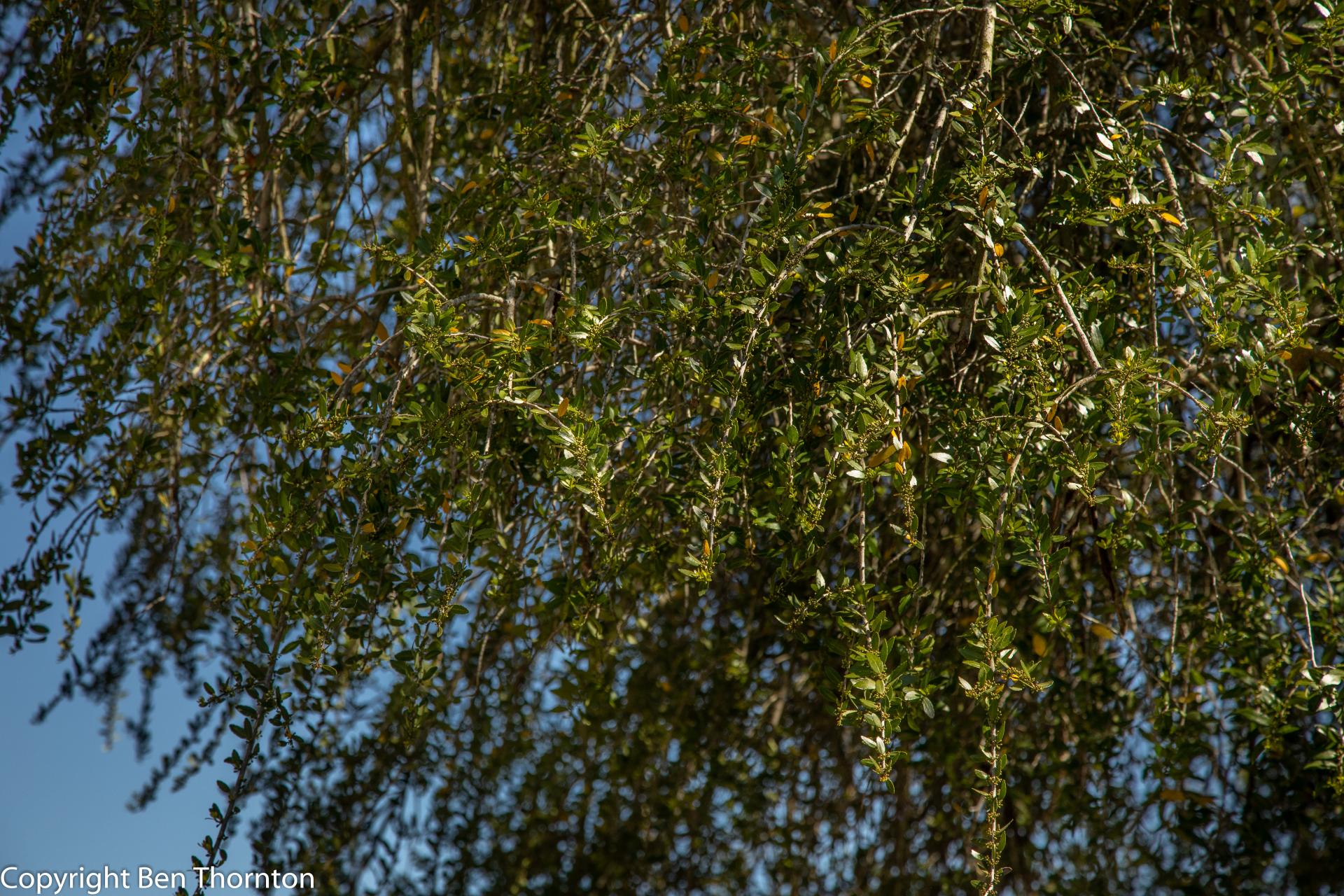 Yaupon holly is an evergreen shrub or small tree reaching 5–9 m tall, with smooth, light gray bark and slender, hairy shoots. The leaf arrangement is alternate, with leaves ovate to elliptical and a rounded apex with crenate or coarsely serrated margin, 1–4.5 cm long and 1–2 cm broad, glossy dark green above, slightly paler below. The flowers are 5–5.5 mm diameter, with a white four-lobed corolla. The fruit is a small round, shiny, and red (occasionally yellow) drupe 4–6 mm diameter containing four pits, which are dispersed by birds eating the fruit. The species may be distinguished from the similar Ilex cassine by its smaller leaves with a rounded, not acute apex.[6][7][8][9][10]
