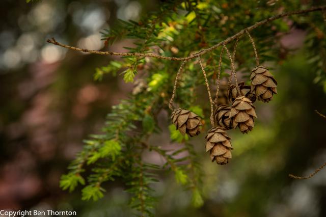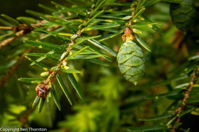 Eastern hemlock populations in North America are threatened in much of their range by the spread of the invasive Hemlock woolly adelgid, which infests and eventually kills trees. Declines in population from hemlock wooly adelgid infestation have led to Tsuga canadensis being listed as Near Threatened on the IUCN Red List.
