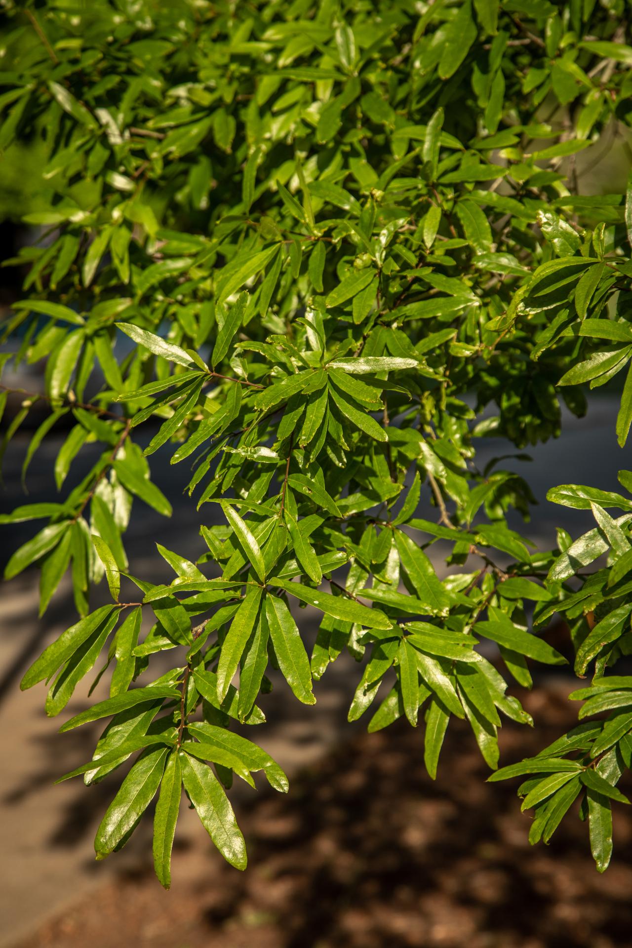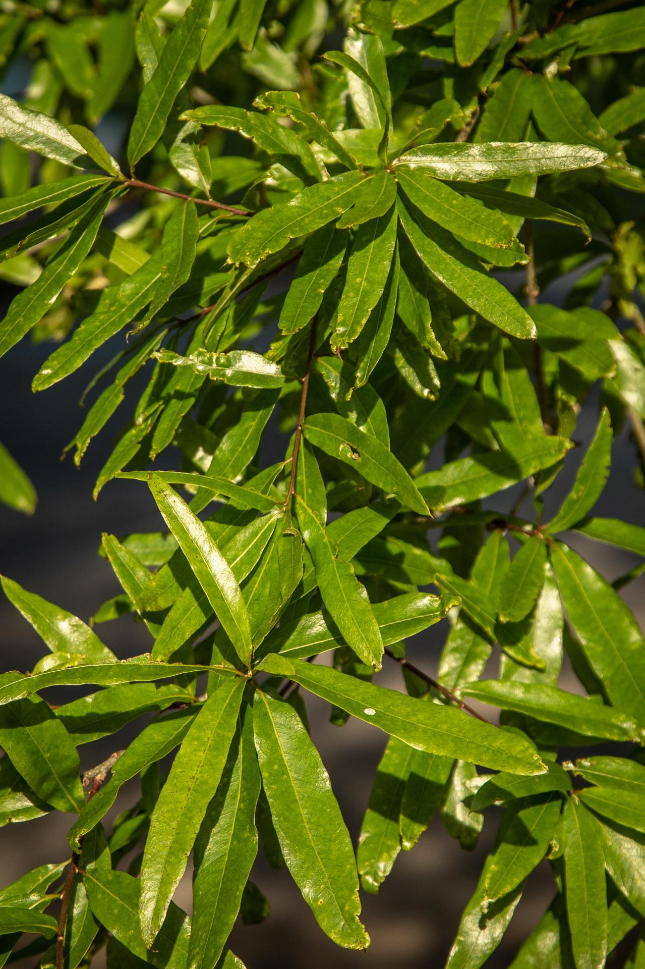 It is a medium-sized tree growing to 20–30 meters (65–100 feet) tall (exceptionally to 39 m, 128 ft), with a trunk up to 1–1.5 m (3+1⁄2–5 ft) in diameter (exceptionally 2 m or 6+1⁄2 ft). It is distinguished from most other oaks by its leaves, which are shaped like willow leaves, 5–12 centimeters (2–4+3⁄4 inches) long and 1–2.5 cm (3⁄8–1 in) broad with an entire (untoothed and unlobed) margin; they are bright green above, paler beneath, usually hairless but sometimes downy beneath. The fruit is an acorn, 8–12 millimeters (5⁄1615⁄32 in) long, and almost as wide as long, with a shallow cup; it is one of the most prolific producers of acorns.[2] The tree starts acorn production around 15 years of age, earlier than many oak species.[3]