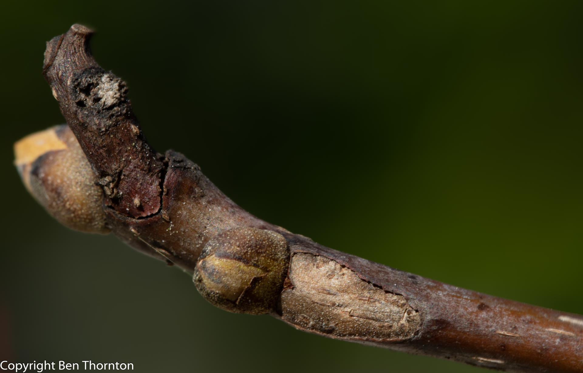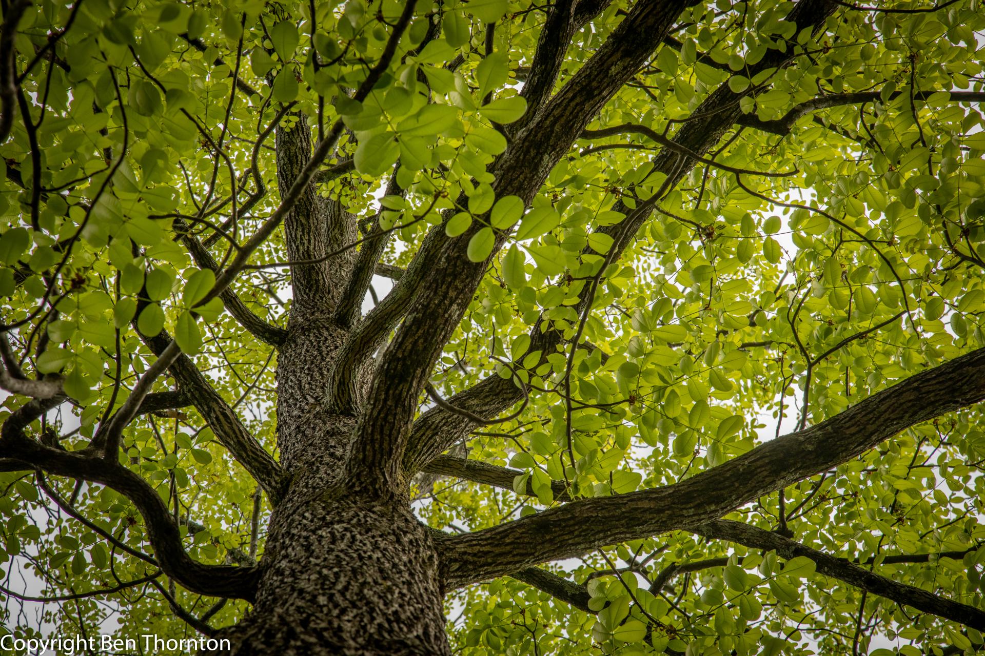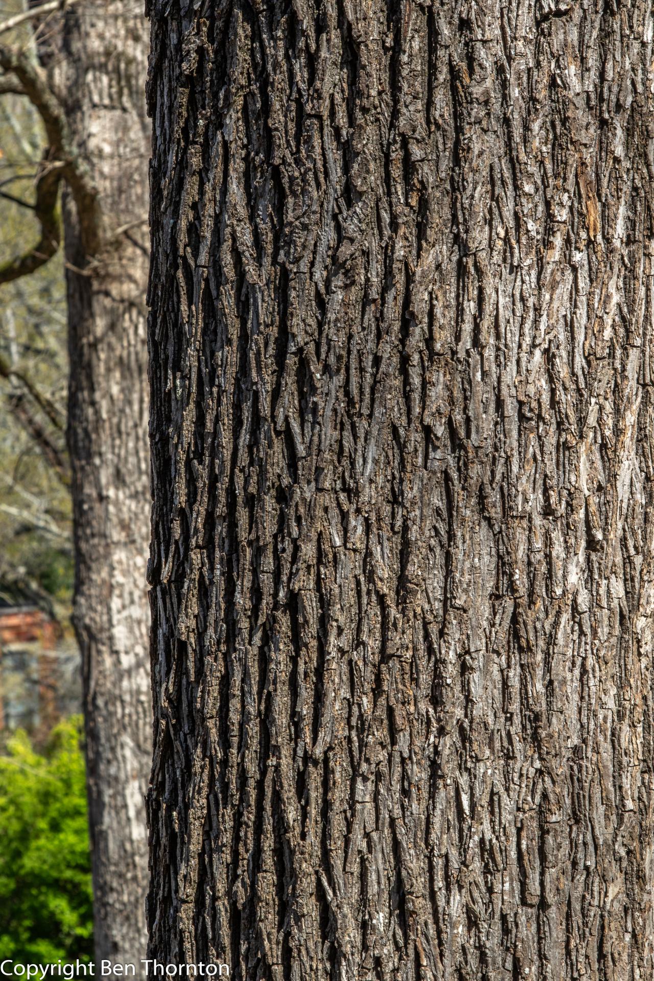 The bark of mature trees is grey, composed of tight, flat-topped intersecting ridges that can appear quite blocky but are generally strap-like. Occasionally, the ridges may separate from the trunk in peeling strips, loose at both ends, a trait characteristic of Shagbark and Shellbark Hickories. Young, vigorously growing trees are more prone to producing peeling bark than mature individuals.